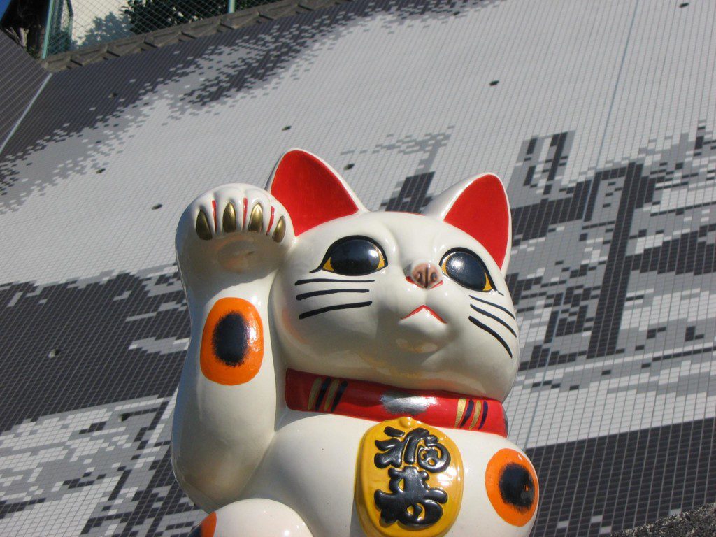 被称作「常滑系」的招福猫,特征是略带福态的四肢和轮廓,一双睁得圆鼓鼓的眼睛,还握着一块会带来好运的「小判」,一副讨人喜欢的模样。在城里随处都能见到如此可爱的招福猫。