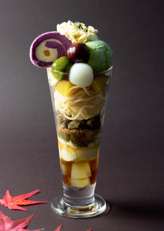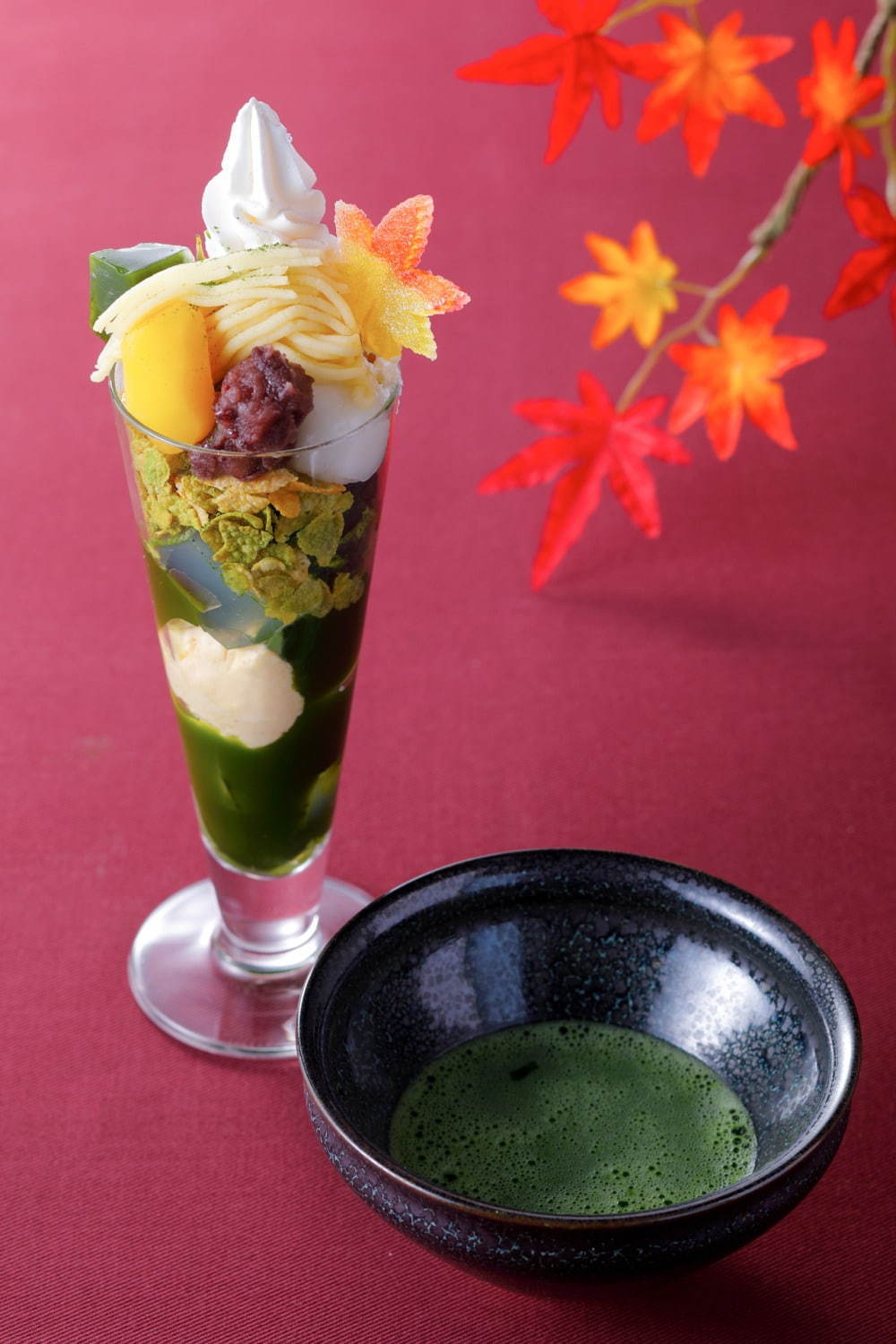 「红叶圣代」是一款能够品尝抹茶浓郁香气的甜点,加入鸣门金时地瓜与栗子的甘露煮等秋季特有食材,上面再以黄橘渐层的枫叶型果冻点缀,色香味具全,还能依照个人喜好另外添加抹茶,让风味更深一层。店家另外提供「红叶圣代」抹茶套餐的选择,可于宇治抹茶等三款饮品中择一,搭配红叶圣代组成套餐。另提供红叶圣代加上秋季限定的栗抹茶蛋糕卷,组成份量满点的「红叶茶会」套餐。