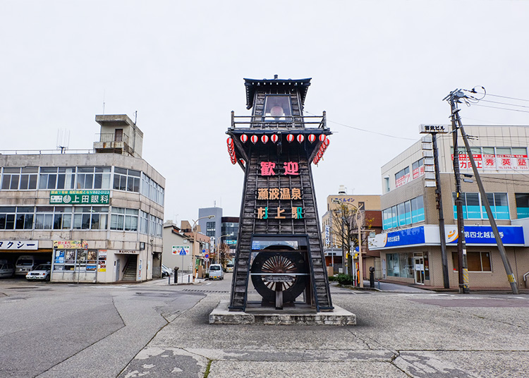 矗立在村上车站前有座古时了望塔楼建筑的知名地标「欢迎塔」,许多游客从这里作为在村上旅游的起点,而村上的商店街道也是从这里开始步行。