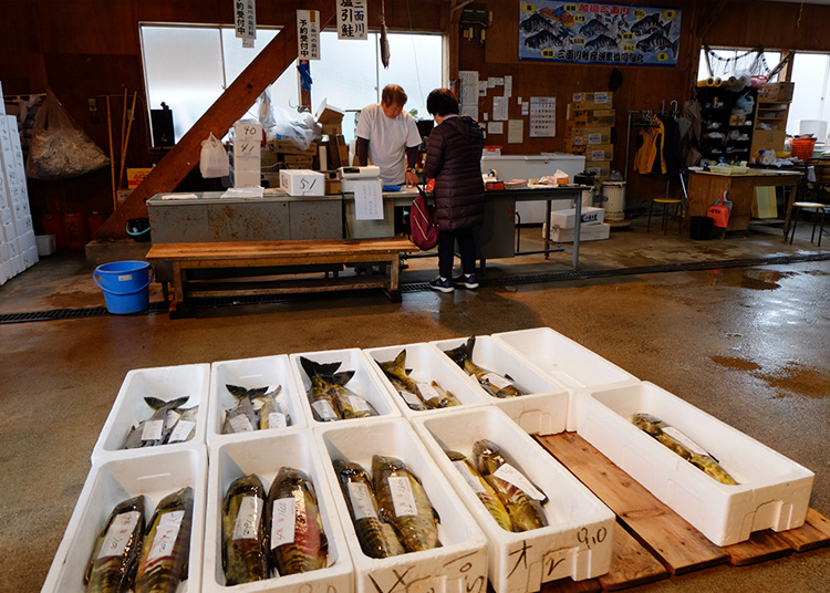 今日捕捞的活跳跳渔获新鲜就近送到河川旁的「三面川鲑产渔协 鲑直卖所」秤重、直接标价贩售。这处直卖所也是于开放鲑鱼捕捞期间才会营业的,在地最新鲜、定价便宜的鲑鱼被装箱后直接排放在地上贩售。