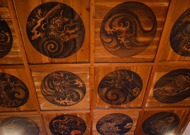 坐落于昔日村上大叶泽城的山脚下的「大叶山 普济寺」是曾出仕于日本战国时代的大名上杉谦信的鲇川望族所建造的佛寺。佛寺本身体现了日本严谨的传统建造工艺,结构优美且宏伟,主殿之中的挑高的天井上还有细致美丽的绘画「有矶周斋の天井絵」,令人叹为观止。