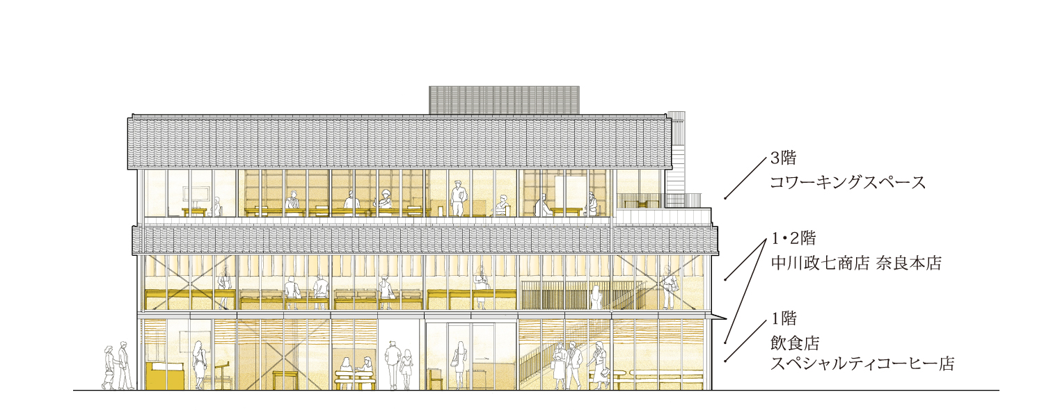 所謂複合商業設施是接近於商場型態的模式,在個佔地約126坪的空間裡,除了進駐以奈良為創業地的「中川政七商店 奈良本店」之外,还有在关西首次展店的餐饮店、精选咖啡店和得以眺望兴福寺五重塔的共享办公空间。复合商业设施的建筑,由知名建筑家内藤广氏操刀设计,以传统京町屋风格构成外型,透过视线穿透的玻璃窗营造开放感,让设施内与户外老街融成一体。