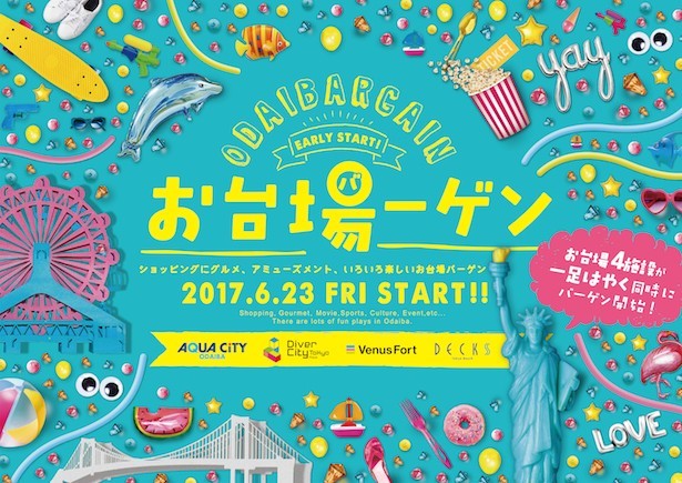 维纳斯城堡VenusFort 购物中心、AQUA City台场、Diver City东京PLAZA商场、DECKS东京BEACH等四个位于台场的购物商场,为了迎接即将到來的暑假,提早在6月23日一同举办「台场折扣季」活动,店家商品最高折扣下杀到2折。