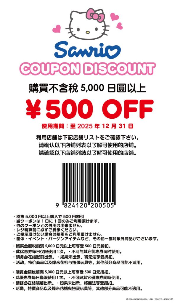 在三丽鸥商店(Sanrio Shop)内,有许多关于三丽鸥角色的产品,包括最著名的HELLO KITTY,还有很多最可爱的产品。由文具到婴儿用品,这里有大量的可爱商品,也很适合作为日本特产。三丽鸥商店位于主要的购物区,非常方便途中停留购物。现在我们要提供给步步日本的粉丝们三丽鸥商店优惠折扣券,让您更省钱购物!