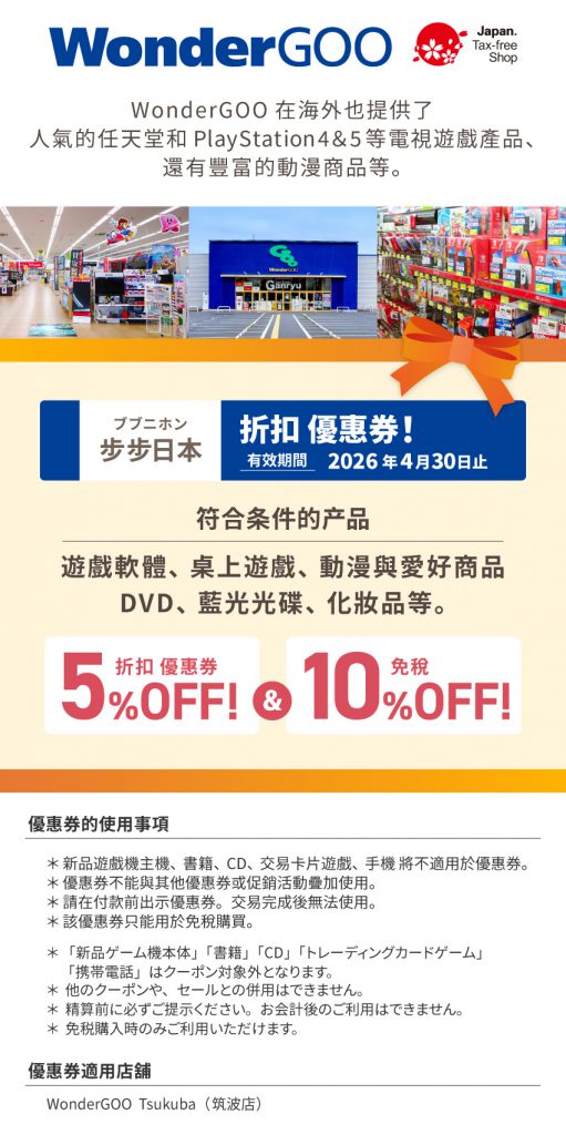 给电玩动漫迷的专属优惠来啦!使用步步日本提供的优惠券,店内商品5%折扣+免税10%,等于享有15%折扣的好康情报,快来收下!