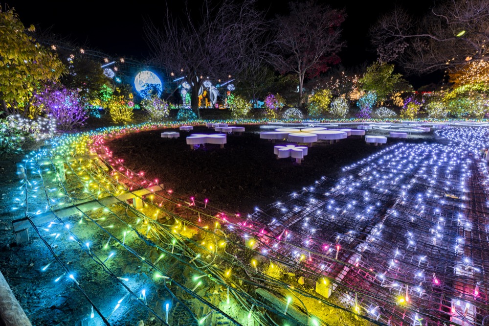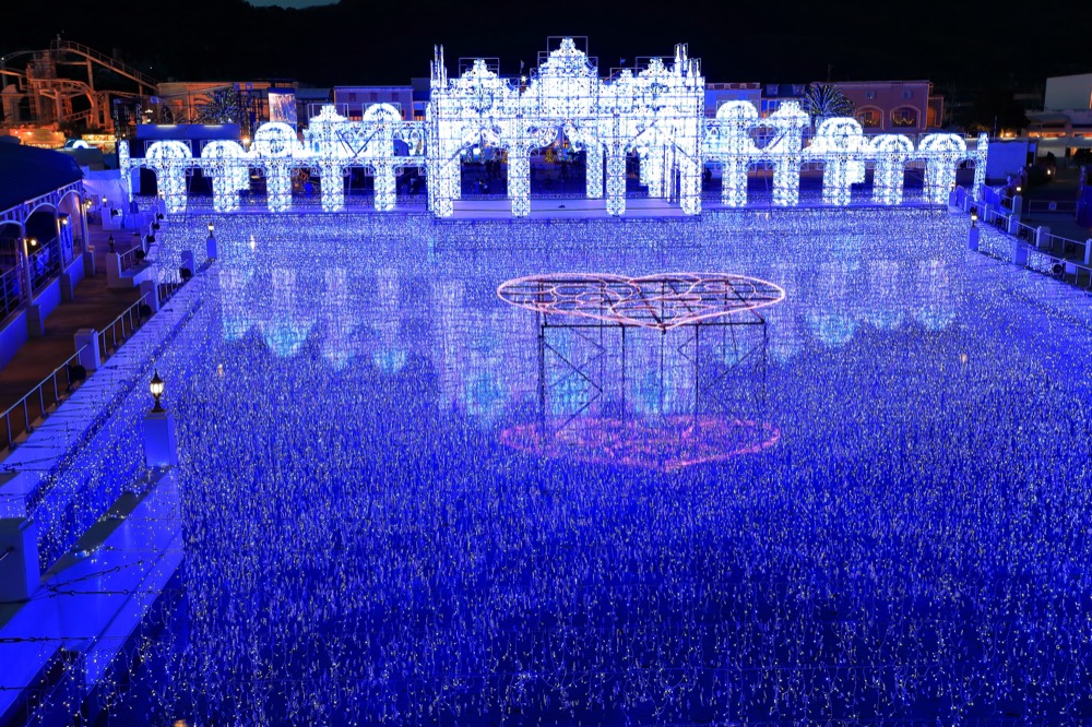 代表象征是日本最大的水上灯光秀「光之大河(水上イルミネーション光の大河)」,数以万计的灯光在水面上绽放,犹如一条璀璨的河流。此外,被选为世界绝景的 200 公尺「光之隧道(光のトンネル华回廊)」更是一大亮点,隧道中的灯光色彩多变,宛若置身于万花筒般惊奇有趣。
