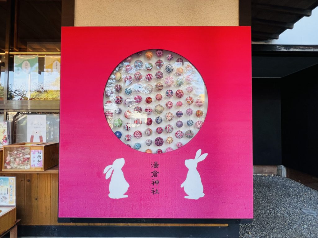 可爱的「手鞠兔(てまりうさぎ)」位于授予所,是充满童趣的打卡景点之一。「手鞠」的圆形象征万事圆满与良缘,常作为喜庆赠礼。「手鞠兔」融合手鞠与兔子,是汤仓神社的新吉祥物,祝愿前来参拜的访客都能感受幸福人生。