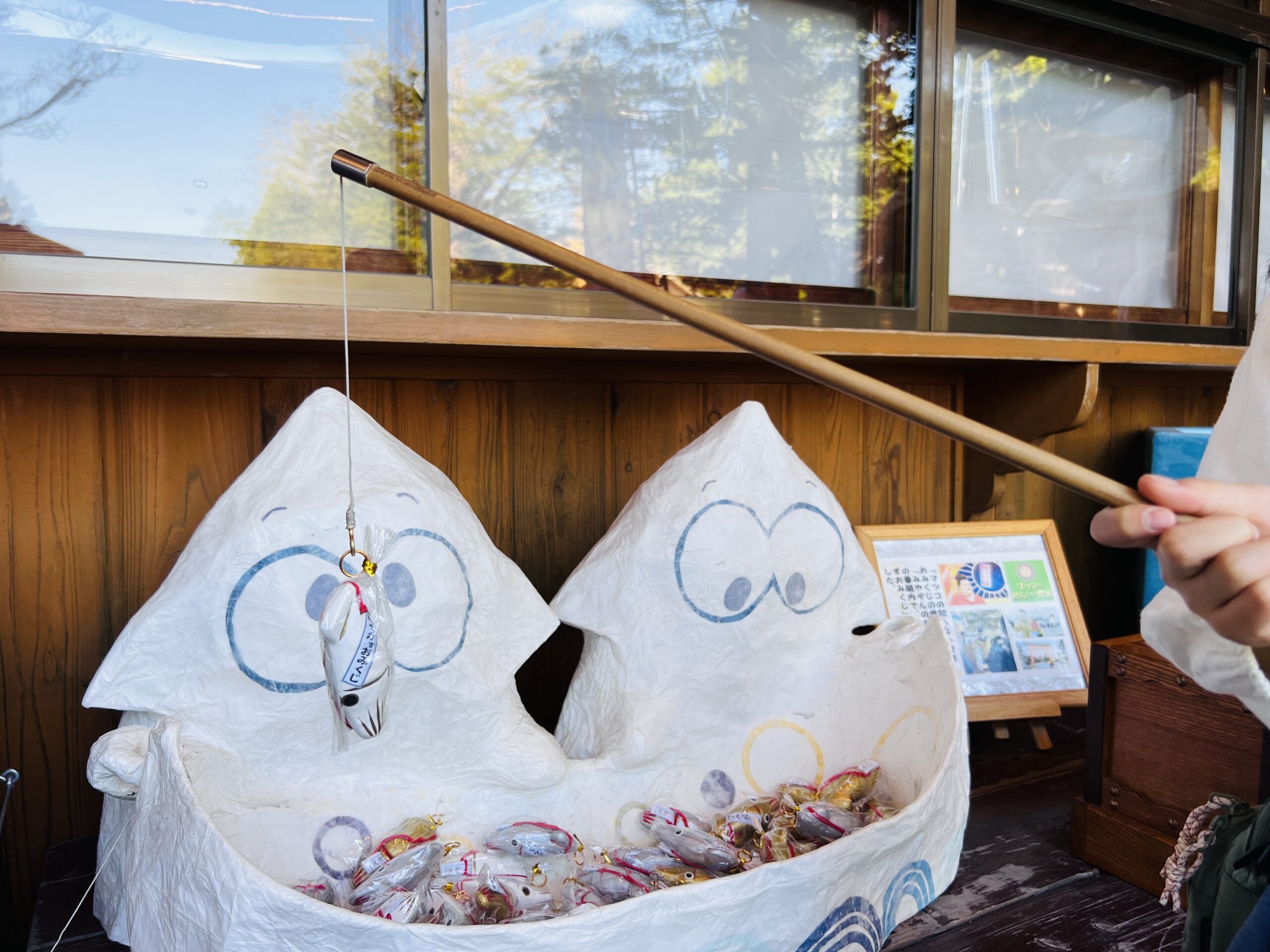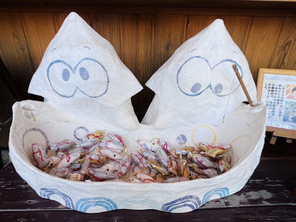汤仓神社的虾夷神签造型是函馆特产:「鱿鱼(イカ)」!鱿鱼造型的神签本身就很可爱以外,更有趣的是,这些虾夷神签都放在小船里面,必须用小鱼竿钓起属于自己的签诗!过程充满趣味与惊喜!