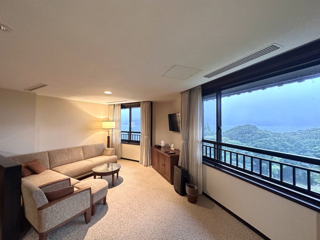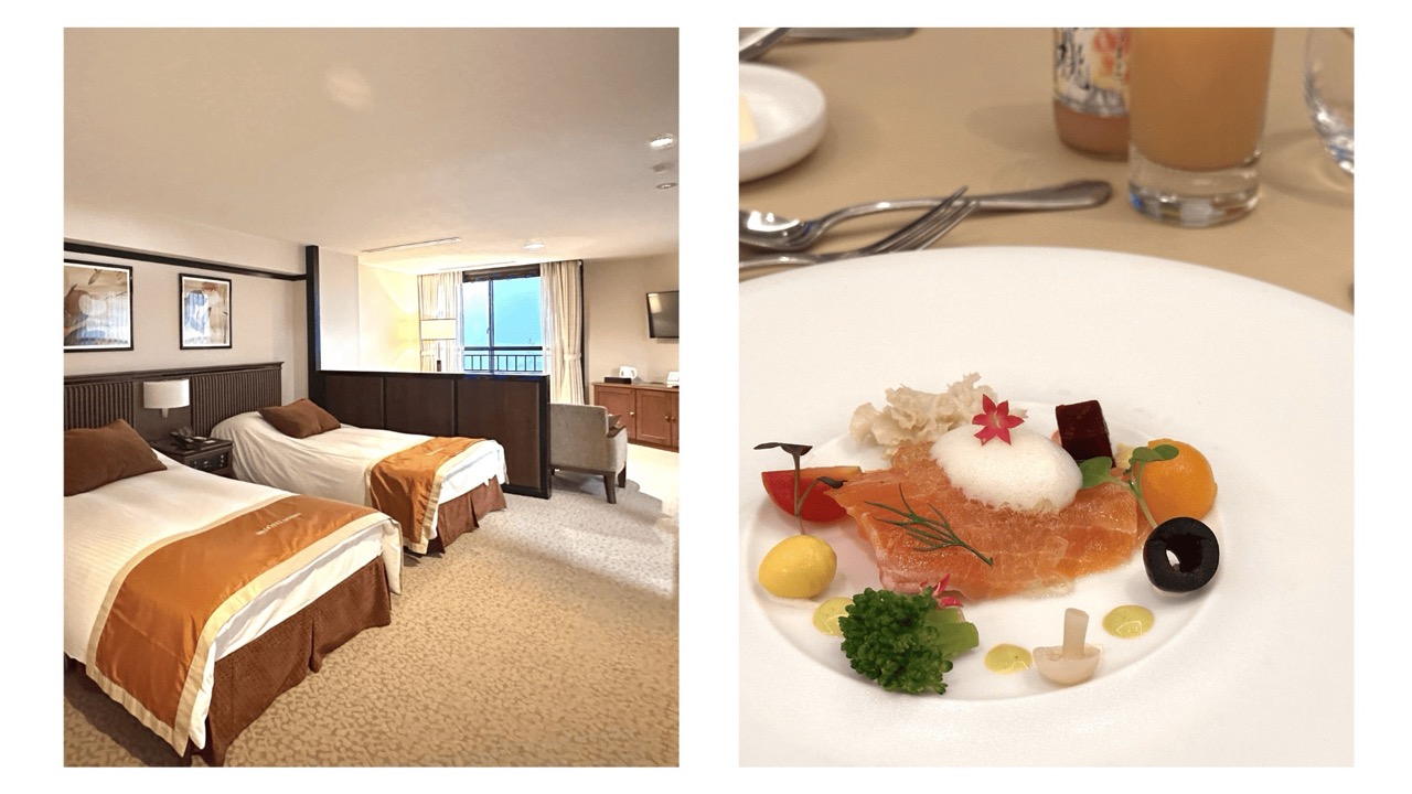 房间设计典雅,舒适度也无可挑剔。原本从房间可以看到庭园和芦之湖景色,但因为天候不佳,除了下雨之外,还有浓浓大雾,虽然内心难免有点失落,但晚上精致的法式料理,还有面向树林的露天温泉,让心情又回到最满点。