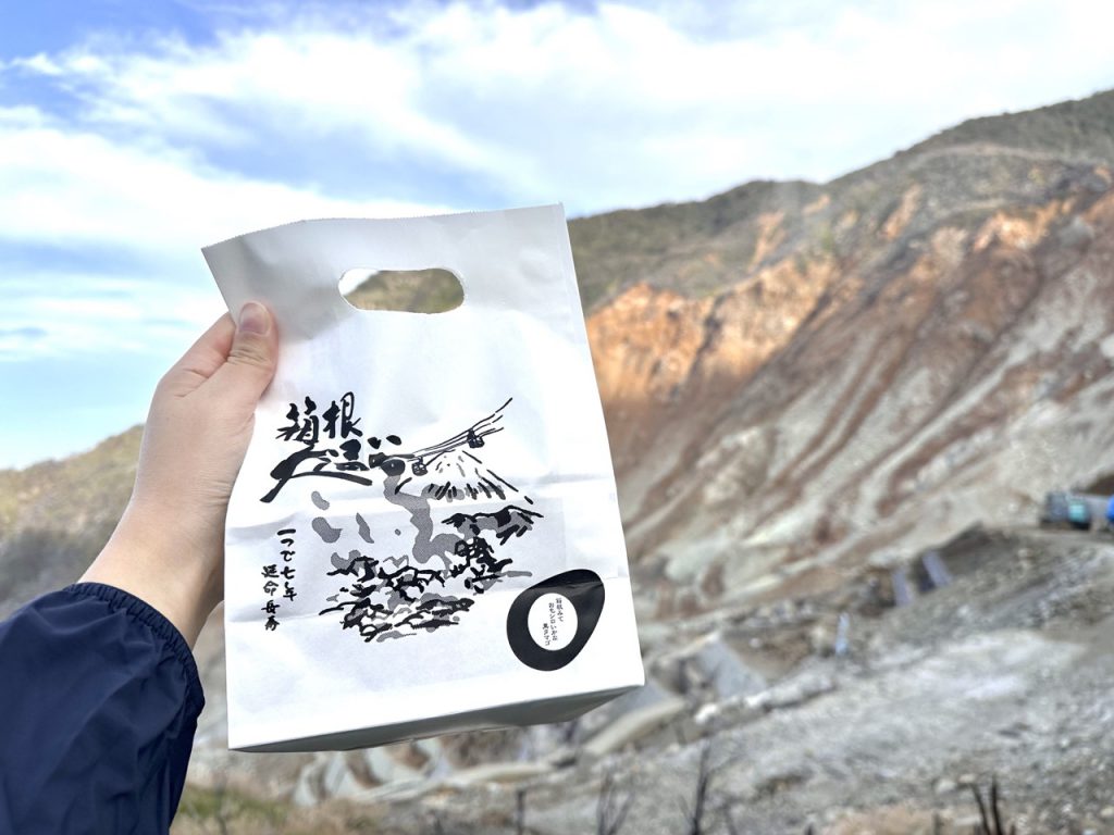 来到大涌谷,怎么能少了这里的名产「黑蛋」呢!进到伴手礼店准备购买黑蛋时,被长长的排队人龙吓到,但大家别紧张,结账的伯伯手脚非常利落,每个客人结账几乎只花了 5 秒的时间,所以前进速度非常快。