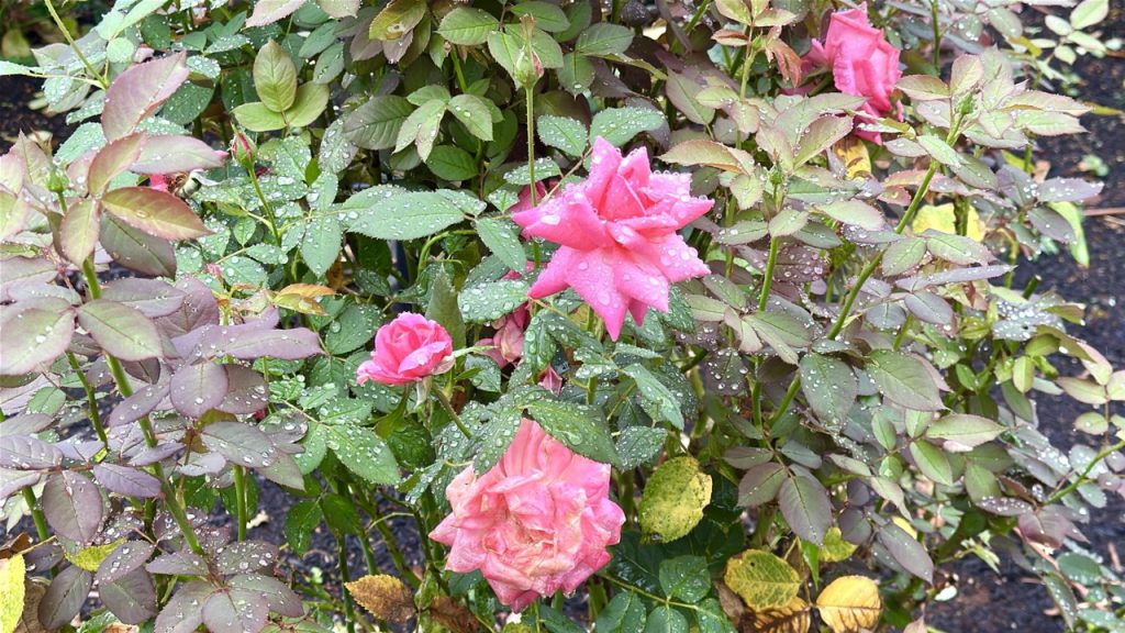 当天下着倾盆大雨,虽然有点扫兴致,但也意外拍到了水珠停留在缤纷玫瑰花瓣上的景象。
