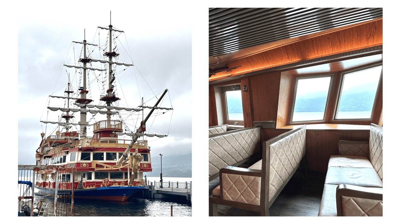 「海贼船」是航行在芦之湖上的观光船,外观气势不凡,鲜艳颜色和华丽装饰都让人叹为观止,船身很大,每艘最多可以容纳 500 人左右。