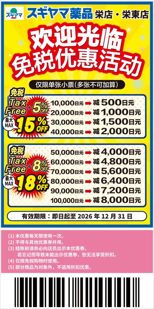 「Sugiyama 药品」提供《步步日本》读者专属优惠券,购物前可先确认商品是否可使用优惠,结账时向店员出示优惠券,即可轻松折抵,享受超值的购物体验!即使是第一次造访名古屋的旅人,也能轻松体验日本在地药妆的贴心服务与划算价格。此外,设有免税专用柜台,可轻松享受免税服务。
