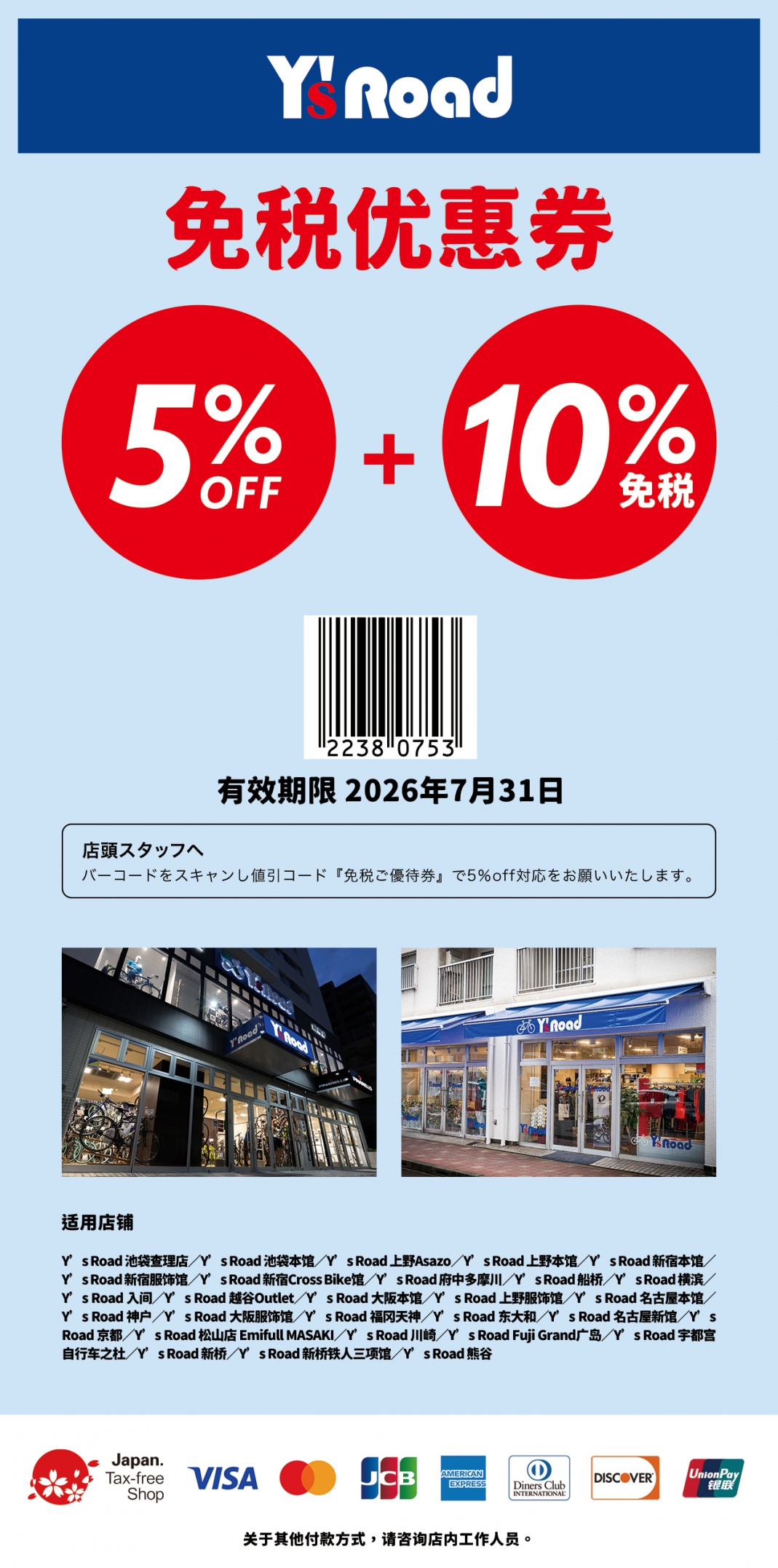 《步步日本》为读者独家介绍可在 Y’s Road 使用的特别折扣优惠券(5% 折扣+免税 10%),千万别错过让旅行购物更加愉快的好机会!