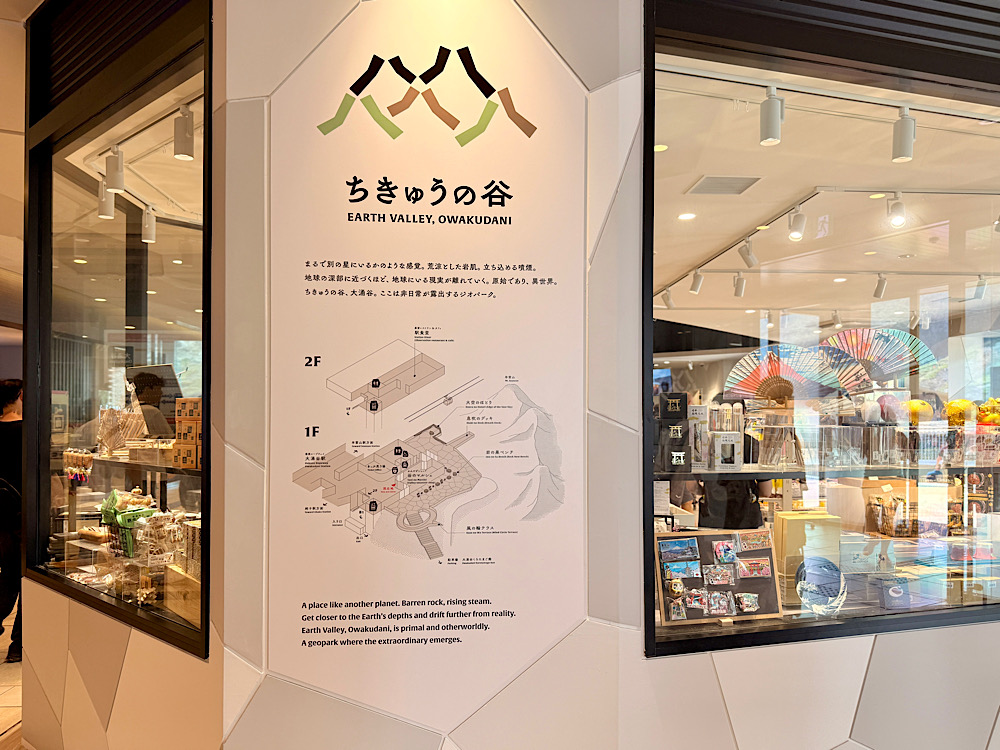 这是大涌谷2025年全新开放的复合式设施「地球之谷(ちきゅうの谷)」,主要是整合了购物、餐饮、与休憩的多功能空间。设施内部包括站内食堂、伴手礼商店与观景休憩区等,让旅客能在火山地形的震撼景致下,悠闲吃饭、采购与休息。