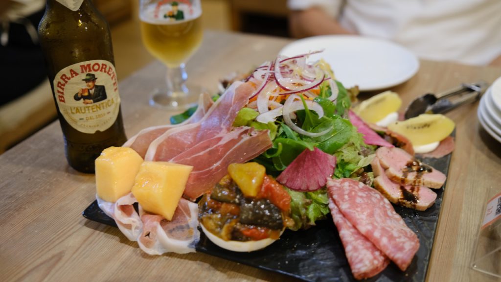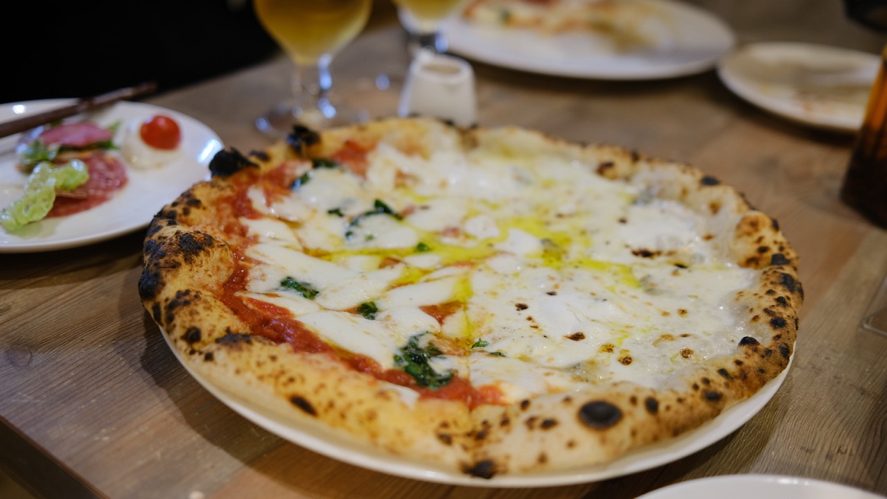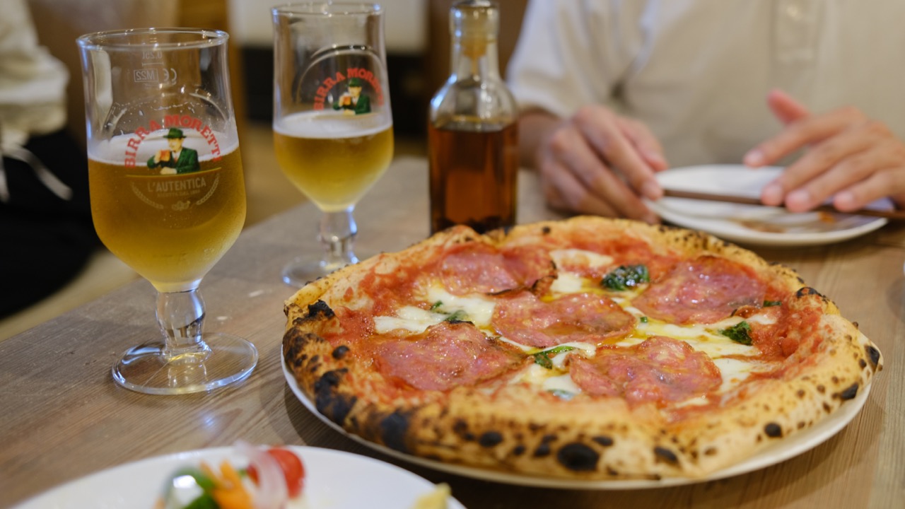 用餐时,若稍微留意身边的服务人员,会发现他们定时向厨房回报各桌用餐进度,并在最合适的时刻,将刚出炉的披萨递上。推荐口味是「恶魔披萨(ディアボラ)」,饼皮酥脆,吸附满满番茄酱汁与起司,橄榄油香气中带点辣味,让莫札瑞拉起司不腻口。搭配义大利 Birra Moretti 啤酒,边品尝披萨边回味旅行时的美好,真的是超级棒!