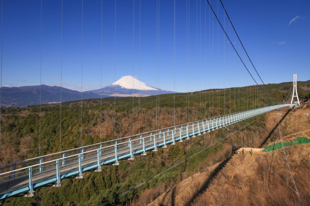 位于静冈县三岛市的「三岛天空步道」(三島スカイウォーク,Mishima Skywalk),跨越山谷,是日本最长的人行吊桥,全长400公尺、桥面高70公尺,于2015年12月开幕。区分为南北两区,南侧设有咖啡馆与伴手礼商店「Sky Garden」,以花卉与玻璃屋设计打造休憩空间;北侧则是森林冒险区,提供滑索(Zip Line)、树冠步道、越野Segway体验等活动。