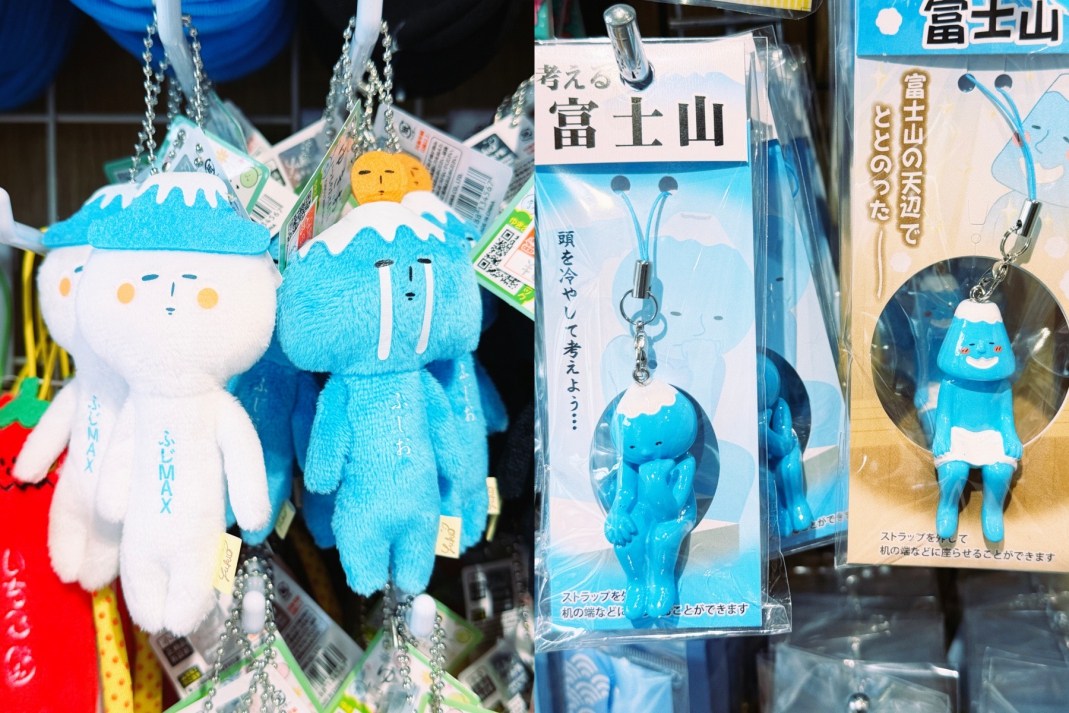 左图:一定是因为富士山一天到晚都躲在云层后面,特地跑一趟却没看到,所以才有那么多哭哭的表情吧?但,哭的应该是游客啊,不是你富士山!右图1:沉思没看到富士山,苦思这景点还该怎么玩?右图2:啊!还好还有美食跟壮丽的天空吊桥⋯⋯终于笑了。