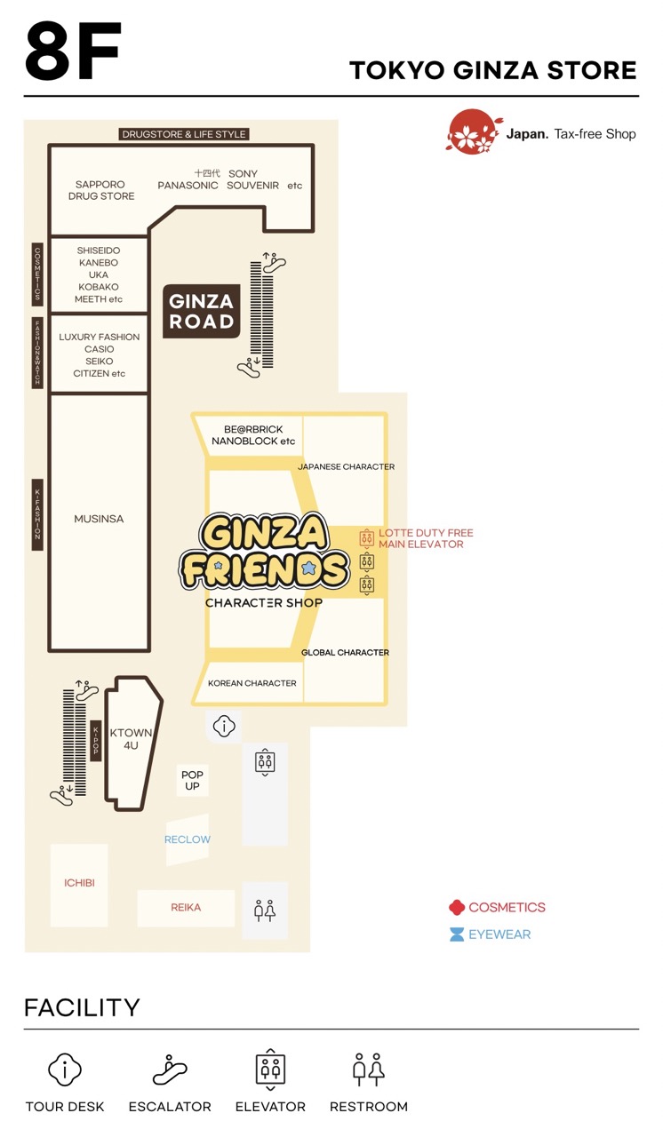 重新开幕后,8楼引入了韩国潮流时尚品牌平台「MUSINSA」、专门贩售 K-POP 官方商品的「Ktown4u」、以及提供韩国人气角色商品的「GINZA FRIENDS」等免税购物区,这些区域即使没有出国计划的顾客也能自由使用。
