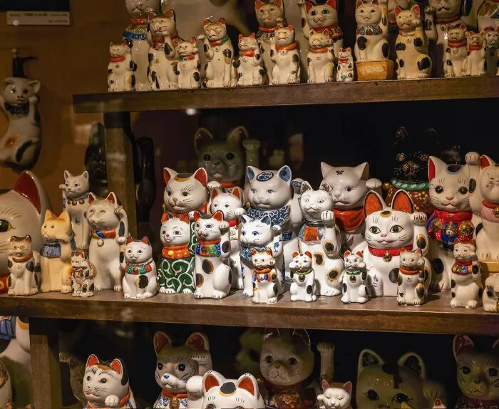 走进「招财猫博物馆」,映入眼帘的是上千只姿态各异的猫咪收藏,从古朴的素烧到现代风的彩绘,每一只都表情生动。