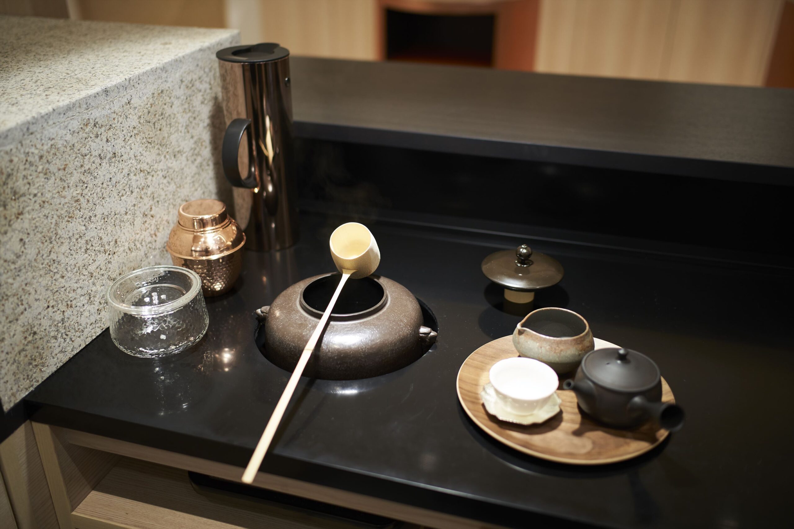 走进馆内,迎面而来的是淡雅的茶香。值得一提的是,入住柜台旁设置了专属的侍茶吧台,由侍茶师(茶艺专家)为每位房客亲自冲泡煎茶或抹茶。这杯热茶,不只是迎宾仪式,更像是将旅人从都市的风声中轻轻抽离,带入另一个节奏缓慢的世界。