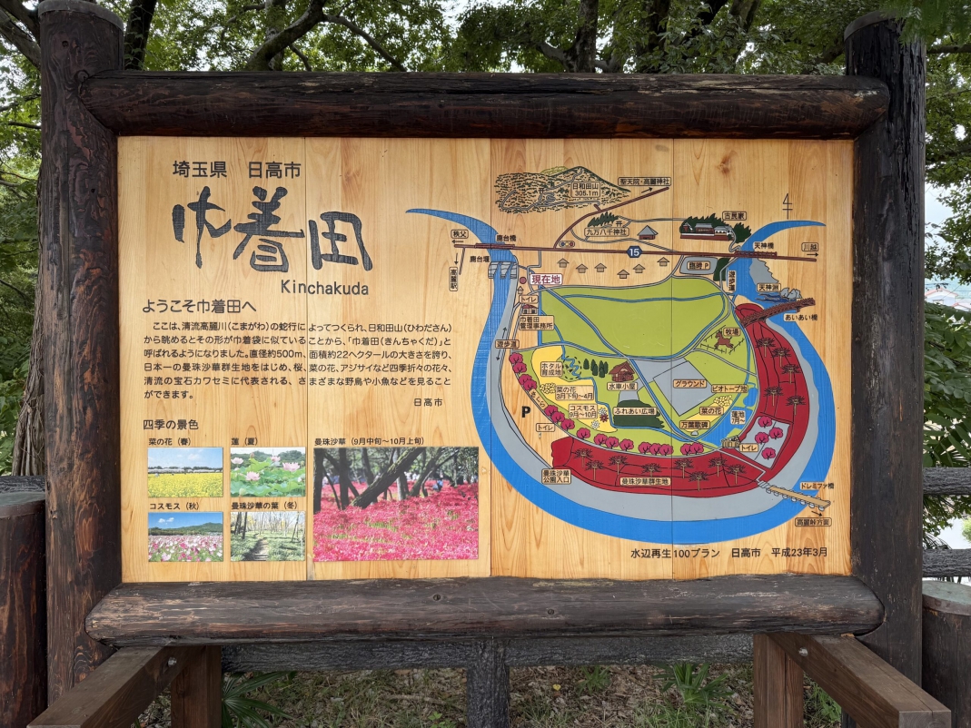 至于「巾着田」称呼的由来,是因为这个公园的河川地形,像收束的布袋而得名。每年深秋,整片河岸地像被红色的烟雾轻轻覆盖,数不清的曼珠沙华一起绽放,形成令人屏息的火红景致。