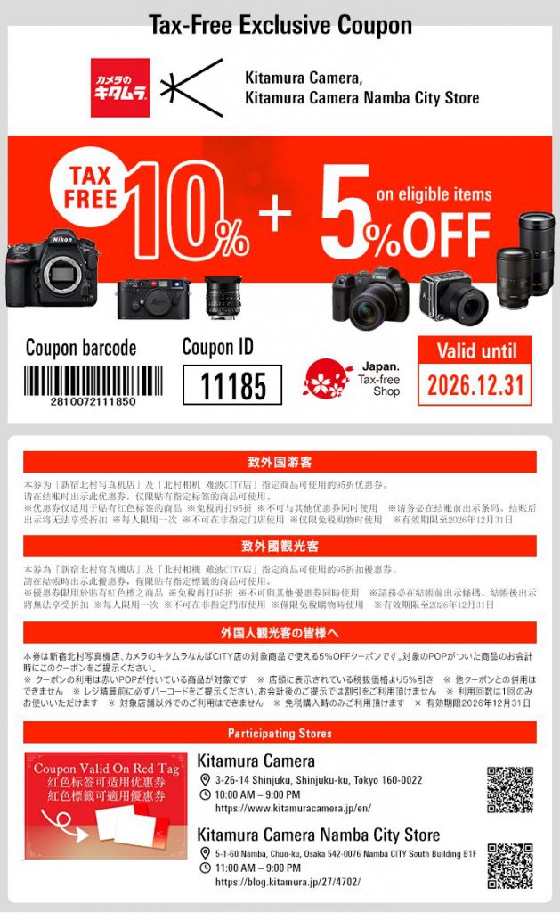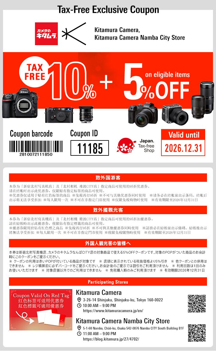 | 优惠券使用条件 | 本优惠券仅限新宿 北村写真机店、北村相机店 难波CITY店的指定商品,享95折。 购买贴有活动海报的指定商品时,请在结账柜台出示本优惠券。 ※仅限购买贴有红色活动海报的商品。 ※折扣按店铺标示的指定商品税前价格的95折计算。 ※本优惠券不得与其他优惠活动同单使用。 ※请务必在结账前向柜台出示优惠券条码,结账后出示将无法享受折扣。 ※可使用手机画面或打印纸本出示。 ※本优惠券限使用一次。 ※不适用于上述指定店铺以外的分店。 ※仅限免税消费时使用。 |