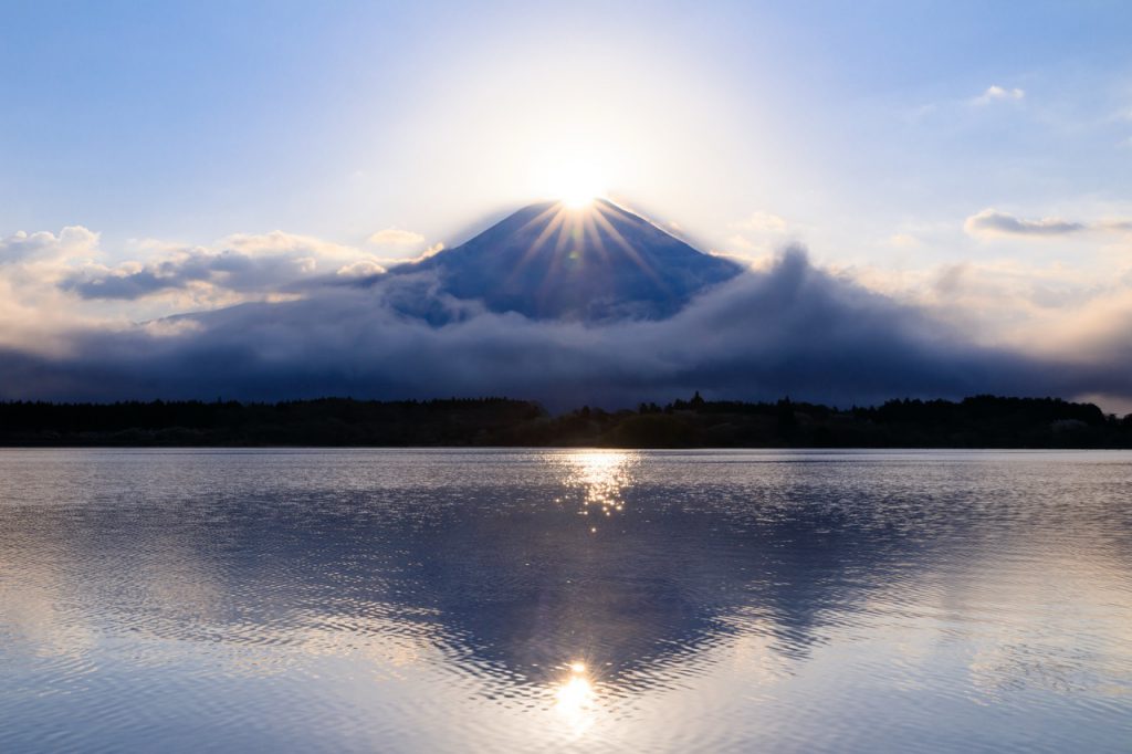 当太阳从富士山顶升起,光芒照耀的瞬间,富士山顶似乎嵌上一颗闪闪发亮的钻石,这就是著名的「钻石富士」现象。