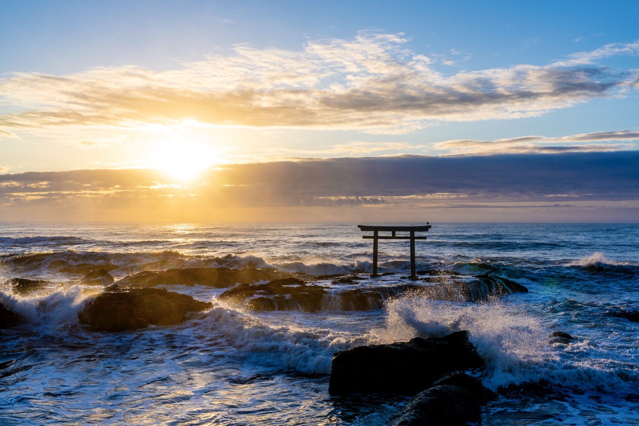 当第一道阳光在海平线上缓缓升起,映照在海面上,远处的「神矶鸟居」屹立于岩石之上,宛如神圣的守护者,与朝阳交相辉映。