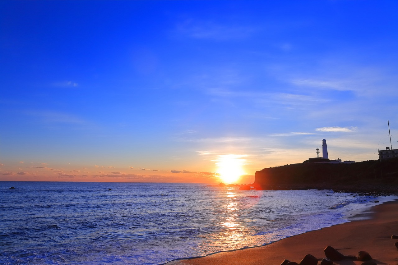 望向这片壮丽的海岸上,可以看到太阳从辽阔的海平面缓缓升起,阳光灿烂,映衬着白色的美丽西洋式灯塔,这座灯塔是铫子的象征,也是国家指定的重点文化财。