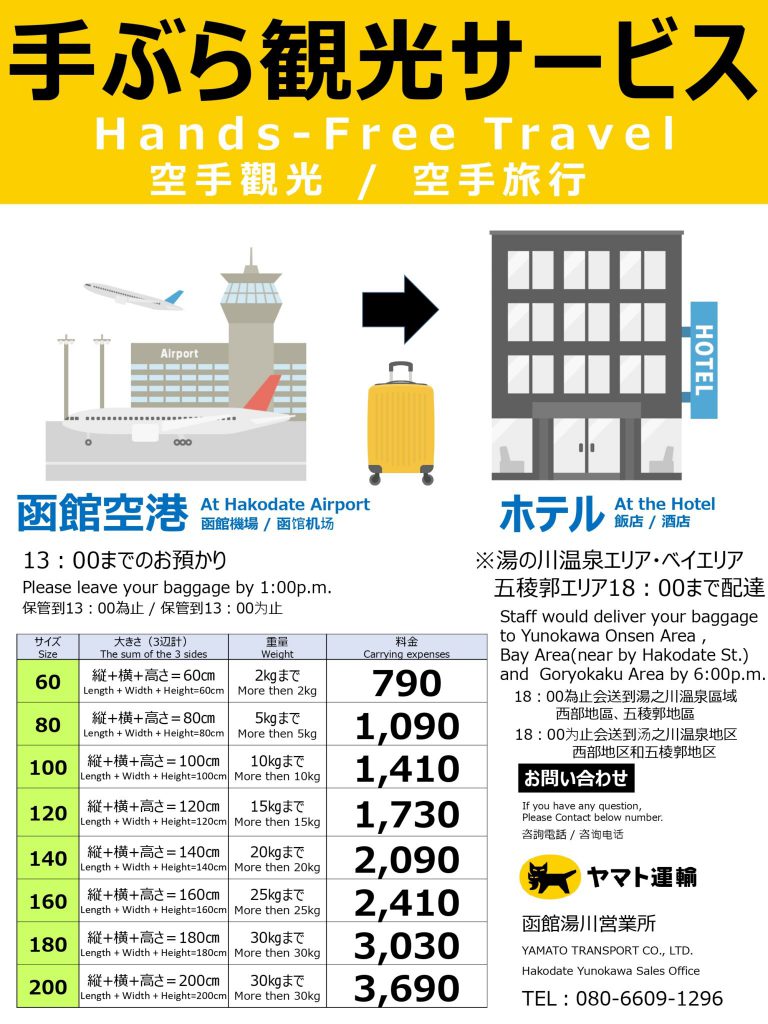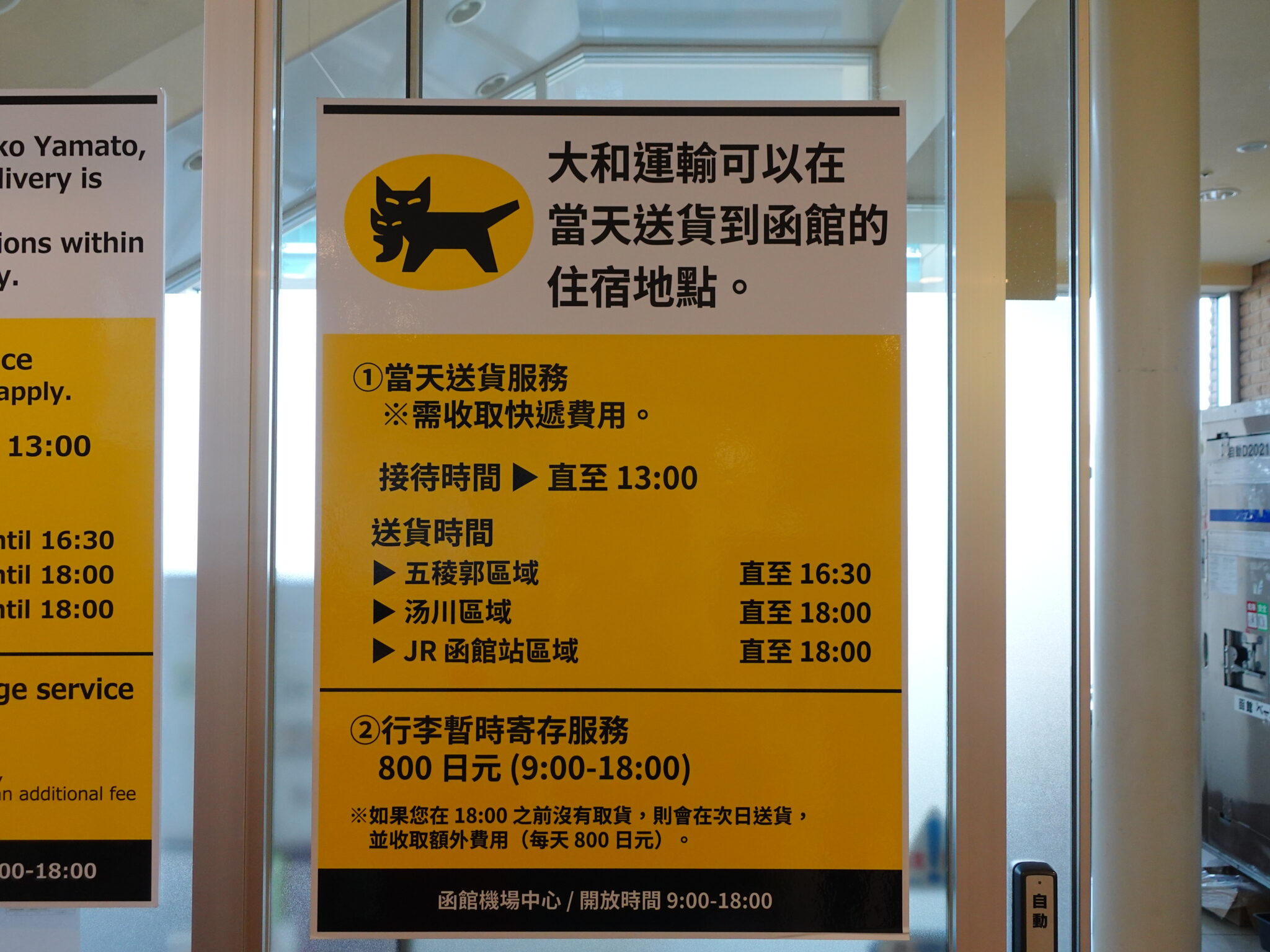 黑猫宅急便与函馆多间饭店合作,不管是入住函馆车站附近、汤之川温泉区或五棱郭地区的,都能从函馆机场直接寄送到当天入住饭店,回到饭店后便能领取行李,不让行李变成旅游行程的拖油瓶!