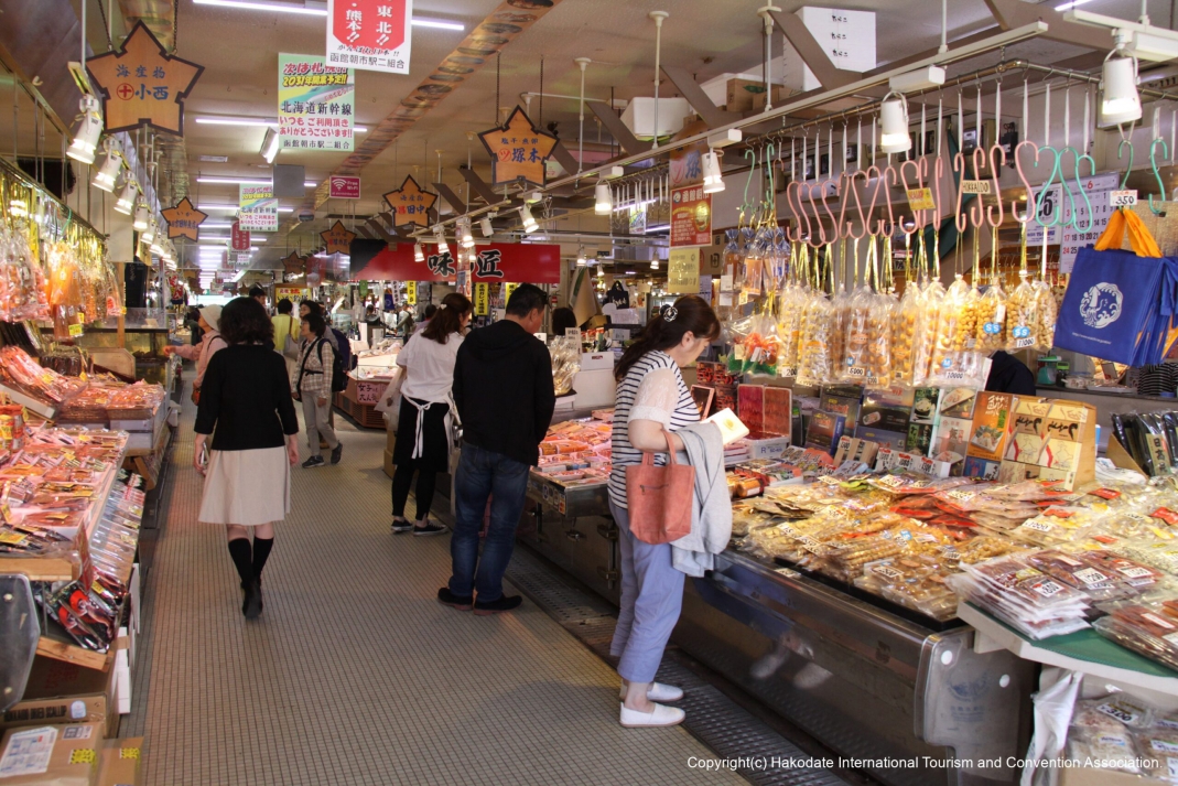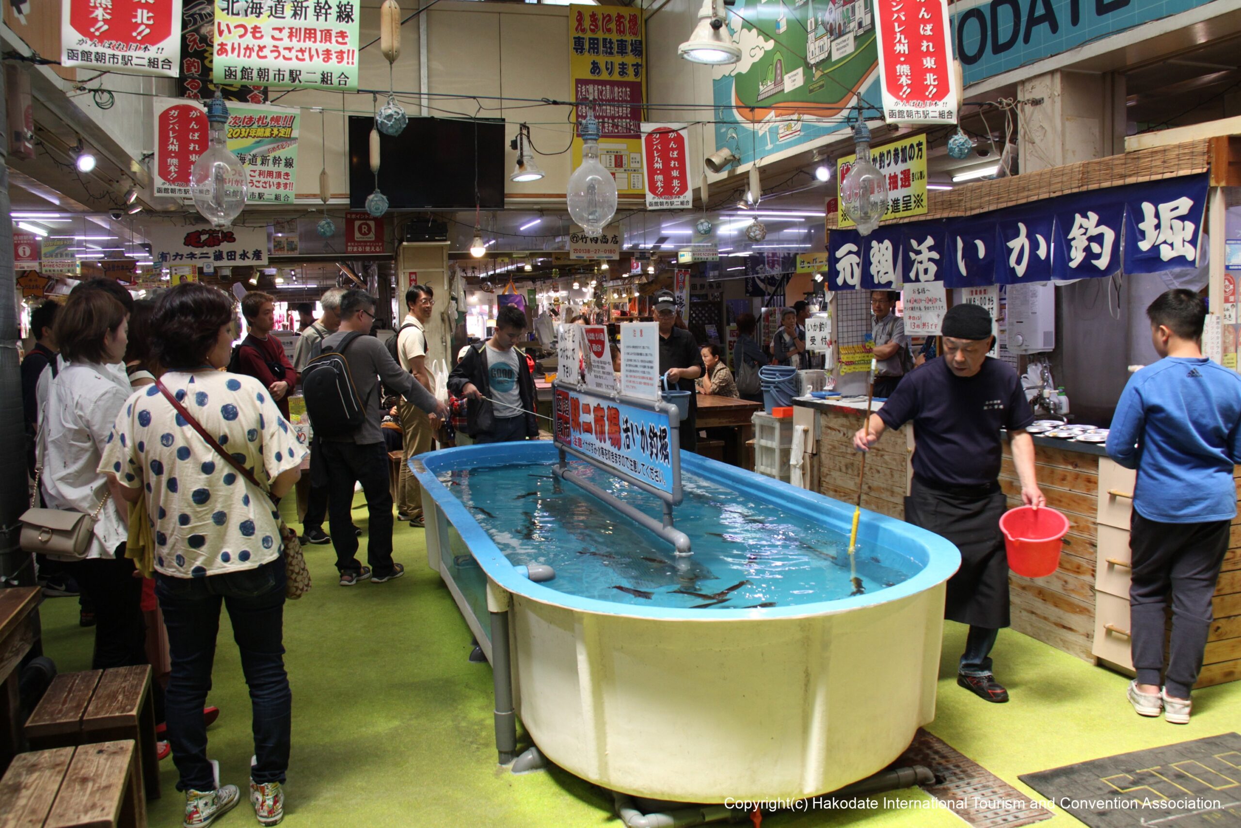 位在 JR 函馆车站旁的函馆朝市是早晨必访的热闹景点,约 250 间商店集结了各种海鲜丼、生鲜海产及蔬果,还能体验超受欢迎的「钓鱿鱼」!