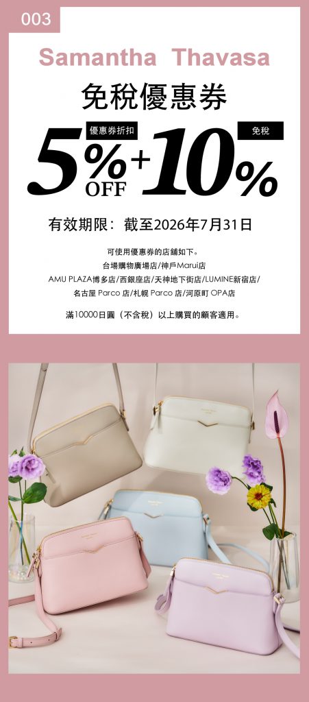 只要在结帐前出示这张「免税10%+额外5%折扣」的专属优惠券,并满1万日圆以上消费,就能在日本全国的 Samantha Thavasa 专柜使用。使用方式简单方便,商品种类不限。