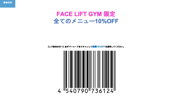 FACE LIFT GYM 提供《步步日本》读者独家专用的 10% OFF 优惠条码,两间店铺皆可使用。将保养行程排进旅途中,不仅能放松,也能让拍照更上镜!