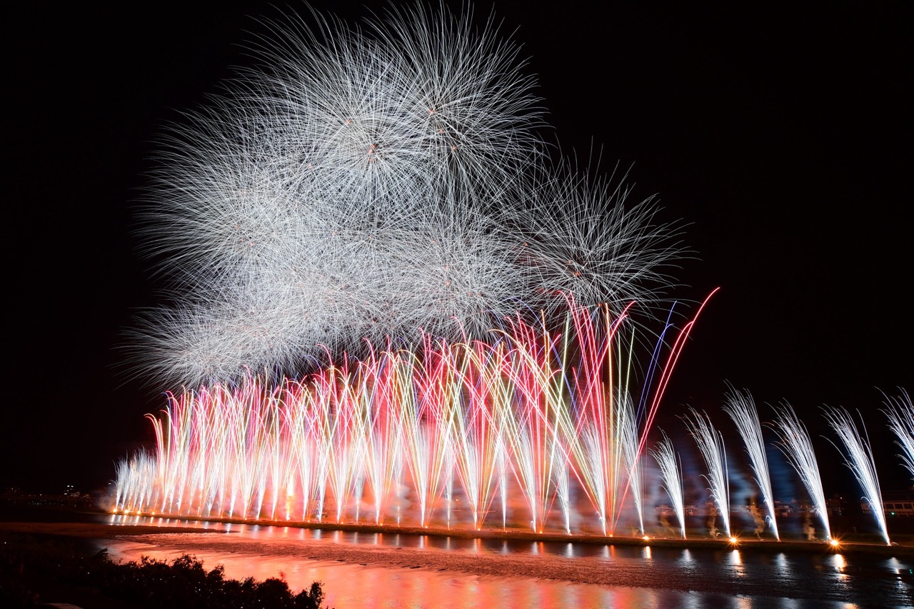 烟火表演内容十分丰富,包括全景般大幅度展开的超宽幅花火,以及与音乐同步的节奏花火,能从不同角度享受烟火带来的震撼与趣味。光影连续照亮夜空与川面,映出层层波光,是长良川夏夜才有的景象。