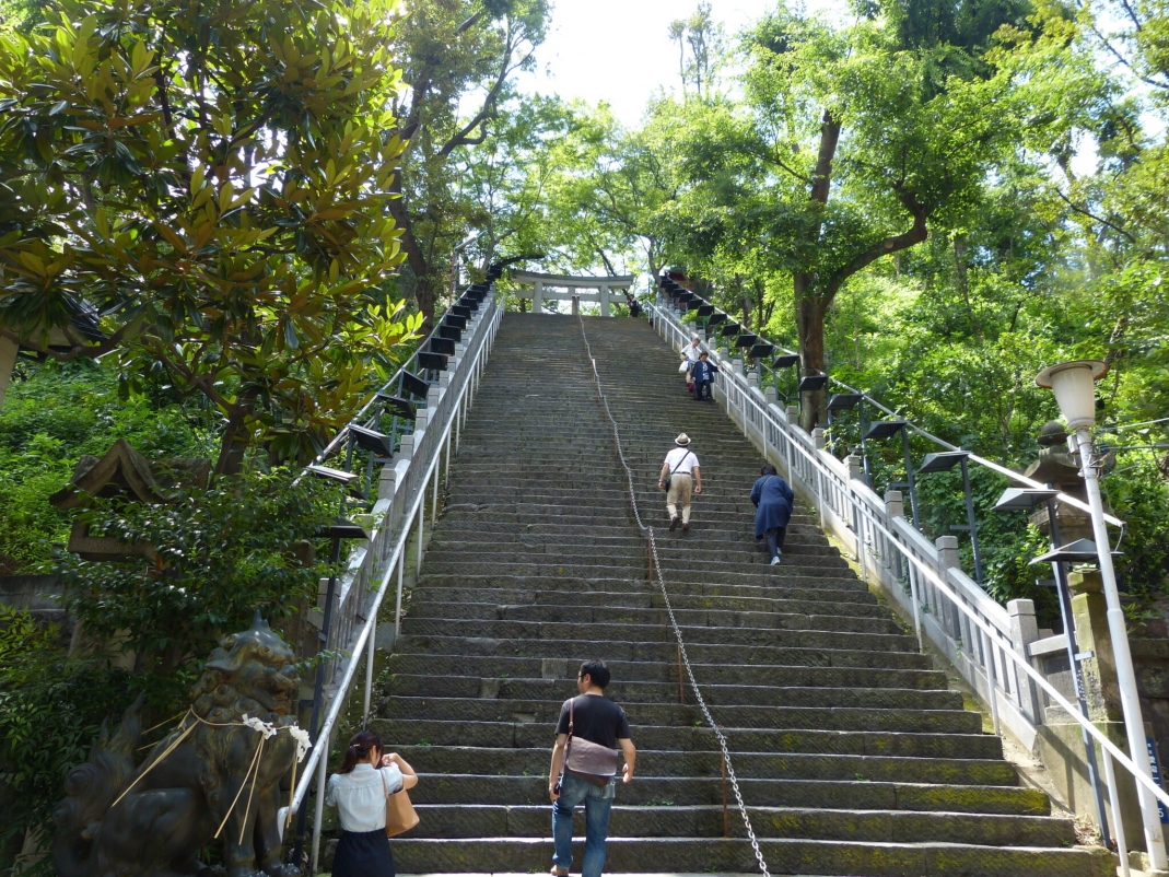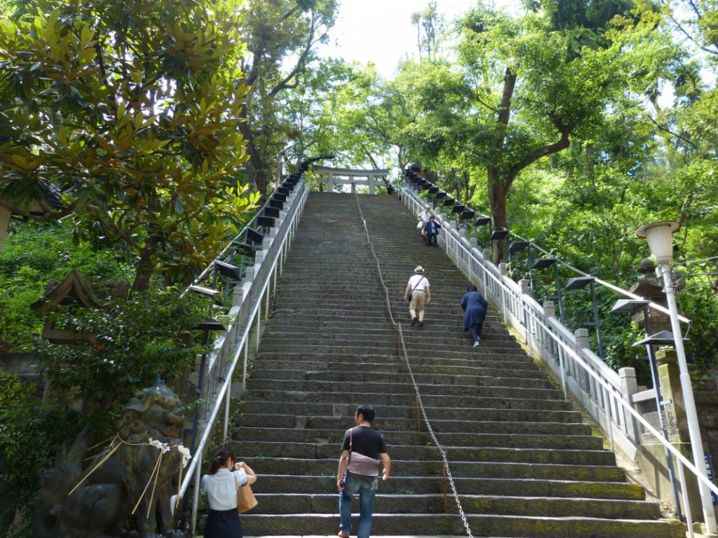 爱宕山是东京 23 区中海拔最高的山,神社的大鸟居到一号鸟居之间有一条名为「出世的阶梯」。在江户时代,马术高手曲垣平九郎应德川家光之命,毫不考虑危险地骑马冲上了这段阶梯,成功的出人头地。