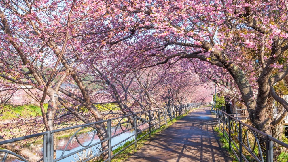 沿着美丽的河津川沿岸,延伸约 4 公里的河津樱花树隧道,拥有约 8,000 棵河津樱。沿着川岸漫步,可尽情欣赏粉红色樱花的浪漫风景。推荐从热闹祭典的对岸欣赏,沿着川岸的河津樱花绽放景象,是不容错过的看点之一。