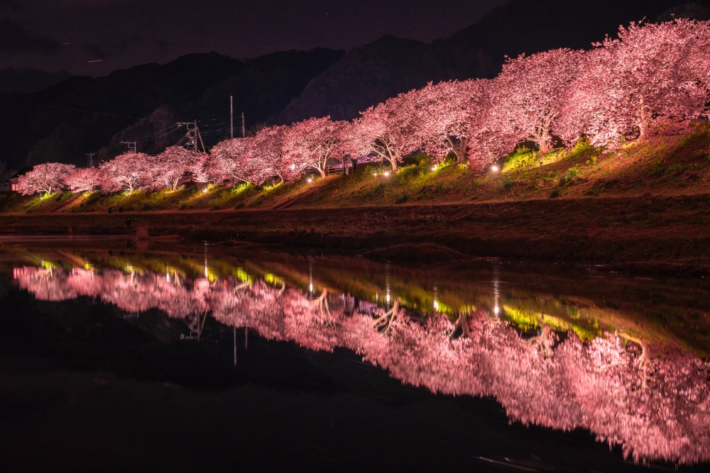 白天的粉嫩河津樱花和湛蓝天空形成鲜明对比,,而晚上的夜间点灯活动(夜桜ライトアップ)更是一大焦点!随着夜幕降临,沿着川岸点燃的夜樱灯光照亮夜空,加上冬末春初的空气清新怡人,是与白天截然不同的风采。樱花在灯光的映照下更显梦幻,是个让人陶醉的约会胜地。