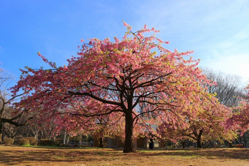 代代木公园的河津樱,在每年 2 月下旬缤纷绽放,约有 10 棵河津樱花树,集结在公园的中央广场。由于代代木公园位于东京都涩谷区,周边有众多时尚的咖啡厅与美味餐厅。推荐外带美味的餐点,与亲朋好友在公园内野餐赏樱!