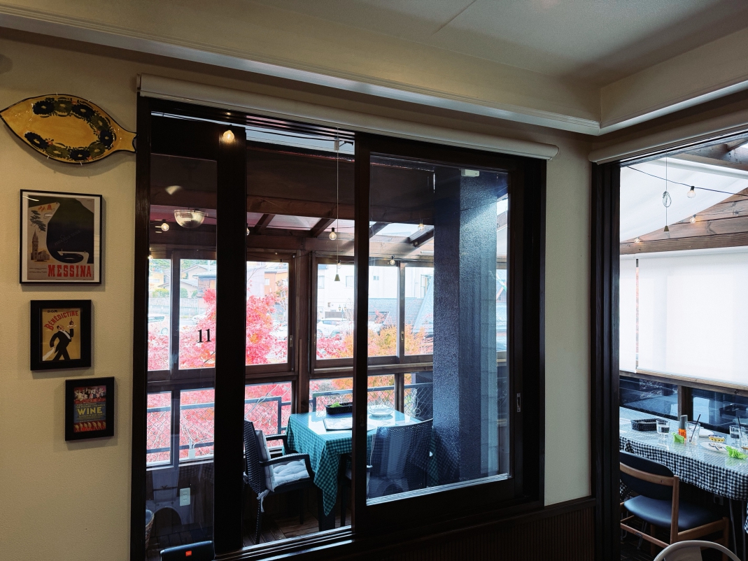 餐厅空间位于二楼,座位宽敞,靠窗位置尤其受欢迎。从窗边望出去,可以看见轻井泽街道的人来人往。秋季时节,街道两侧一字排开的红叶,替餐桌增添了几分浪漫。