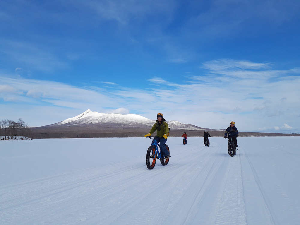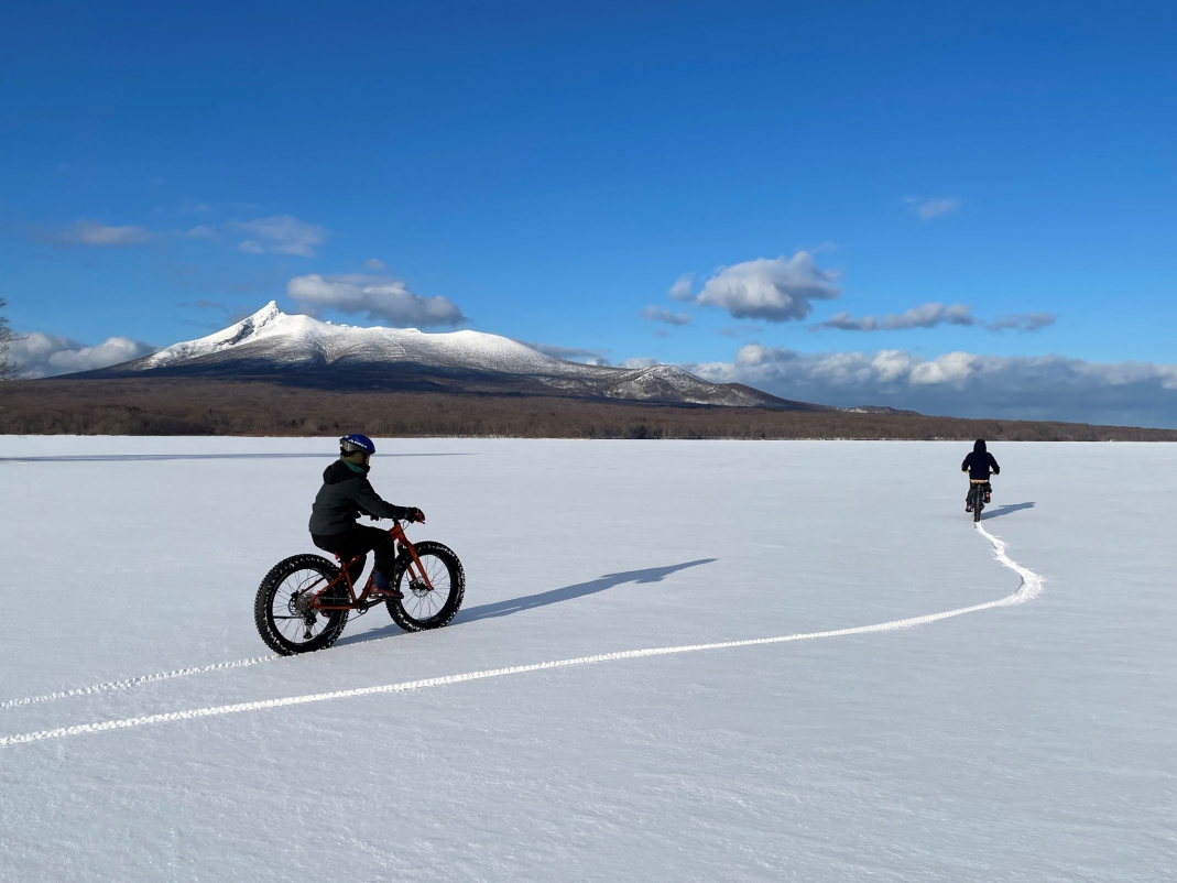 骑着特制的胖胎自行车(ファットバイク)在冰上探险,导游带着大家到观赏驹之岳的最佳绝美地点,大家一起用冰块杯品尝北海道七饭町产的苹果汁或甜酒给一起干杯,光是为了这个杯子就值得来参加!