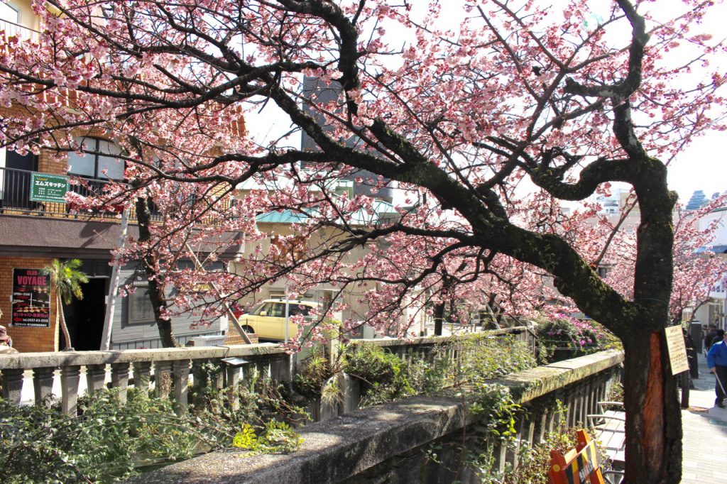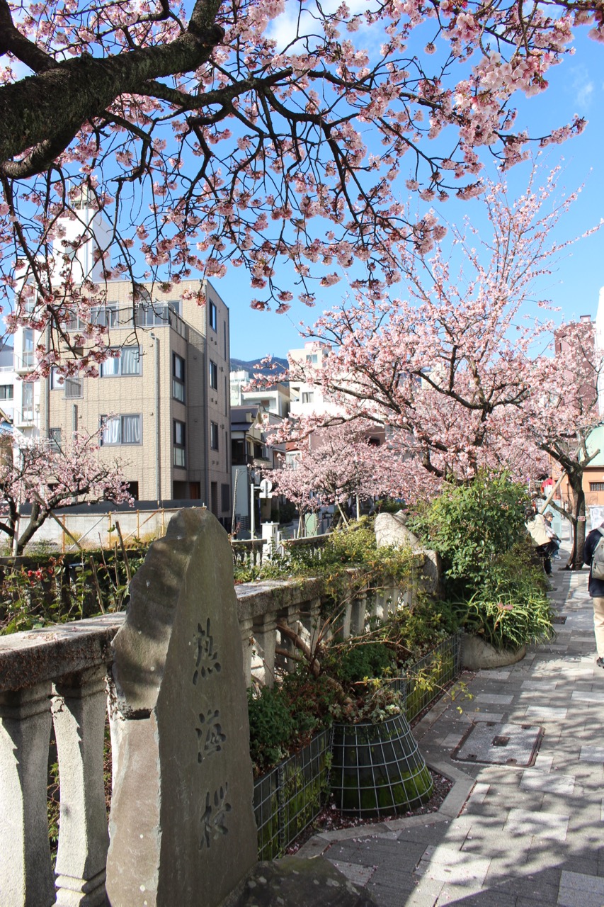 热海樱,樱花种类当中的「寒樱」品种,号称是全日本最早开的樱花。在靠近热海站商店街的「糸川游歩道」沿着小溪,有一条散步的樱花步道,这里的樱花树已经在一月底开花了。热海樱的花期久,大约到二月底、三月初仍会开花。所以二月到三月初如果到日本玩,不妨考虑安排两天一夜的热海温泉之旅,顺便赏樱。