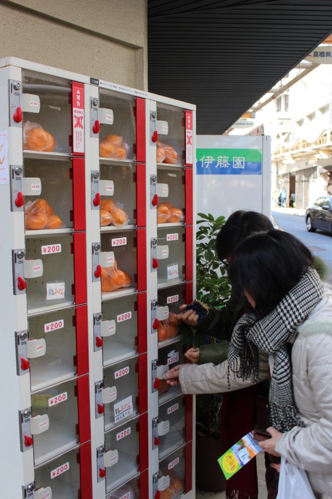 游步道尽头的商店街,常能看到这种置物柜似的柑橘贩卖机,投币后就可享受当地自产的美味柑橘!