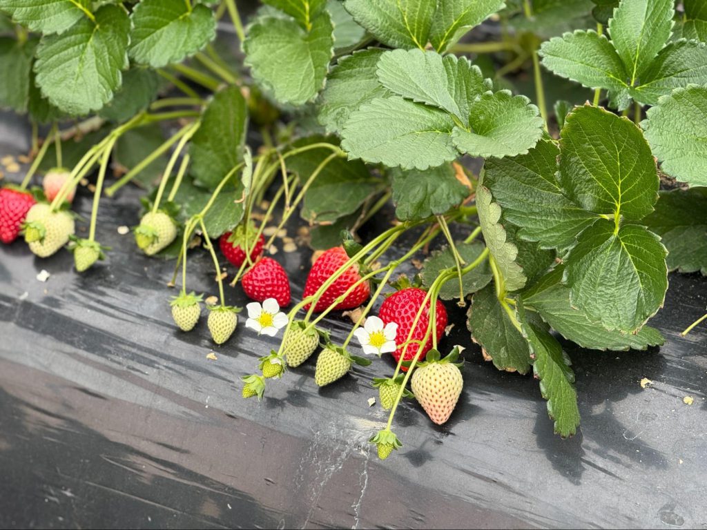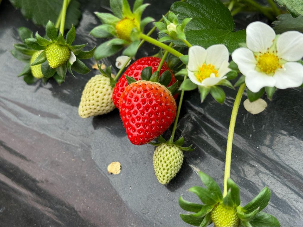 果园主人笑着介绍,草莓的栽培方式大致可分为高架与地面两种。高架栽培方便采收,对腰部负担较小,也常见于观光果园;而地面栽培,则更贴近草莓原本的生长状态,需要花费更多心力在环境管理与照护,但能细致地控制果实成熟的节奏与品质。眼前这片草莓园,正是以低矮栽培的方式,细心孕育出「あまりん」独有的甜味与口感。