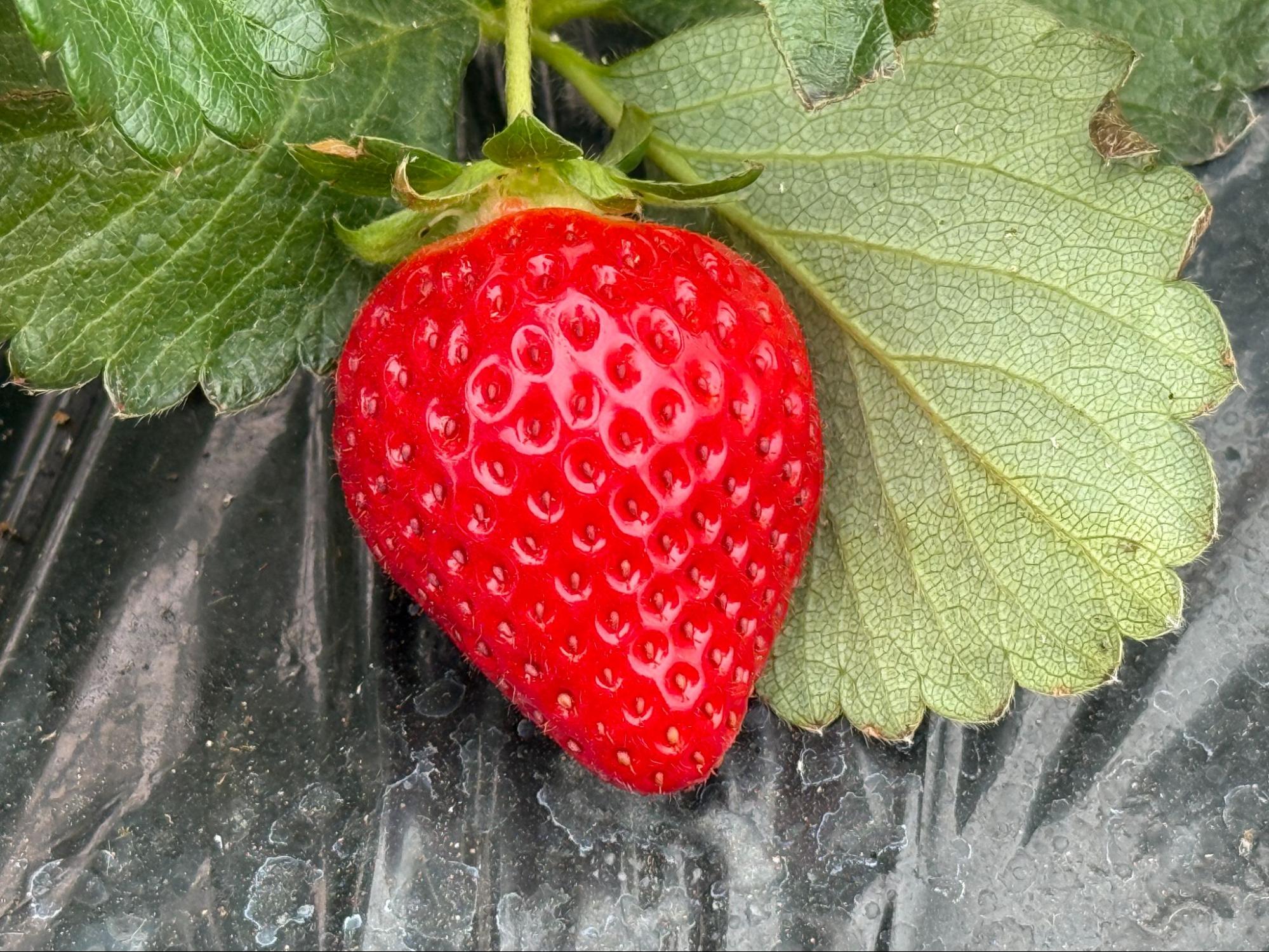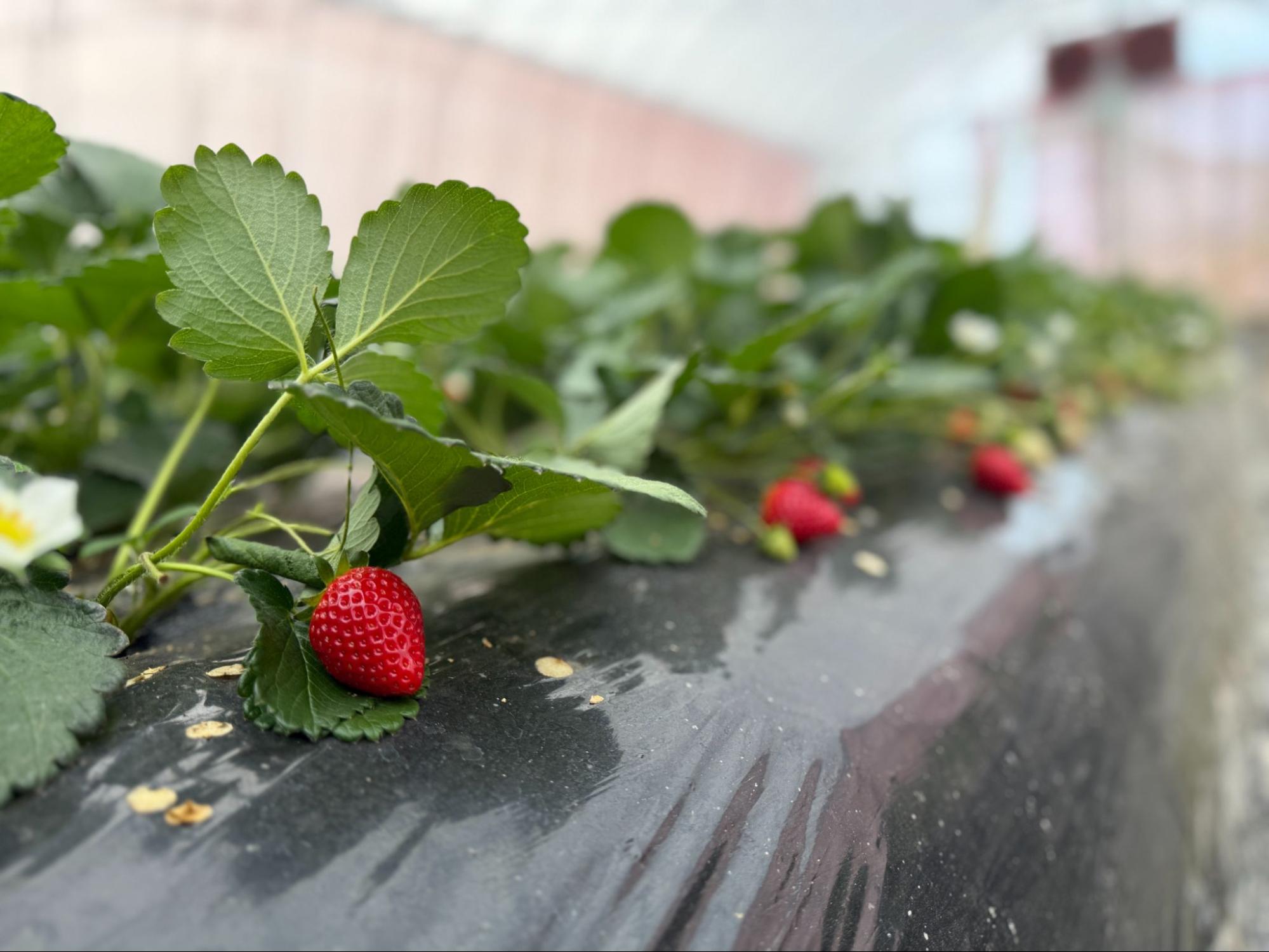 再次搭上专用接送车前往草莓果园,走进温室视线立刻被一整排低矮生长的草莓吸引。红通通的果实几乎贴近地面,一颗颗饱满地垂挂在绿叶之间,与许多人熟悉的高架栽培草莓园景象截然不同。