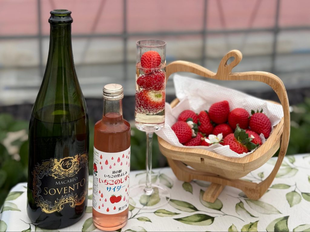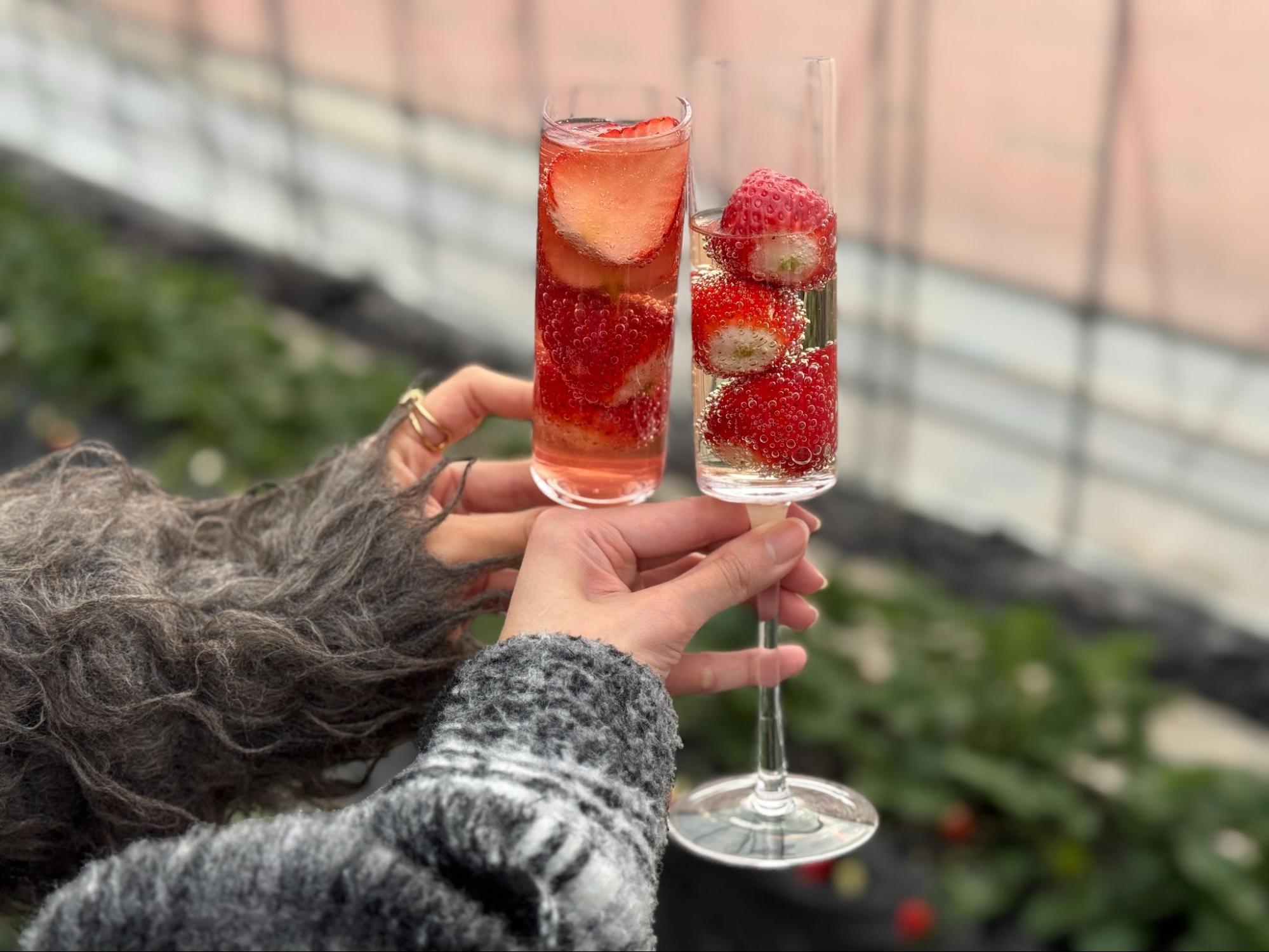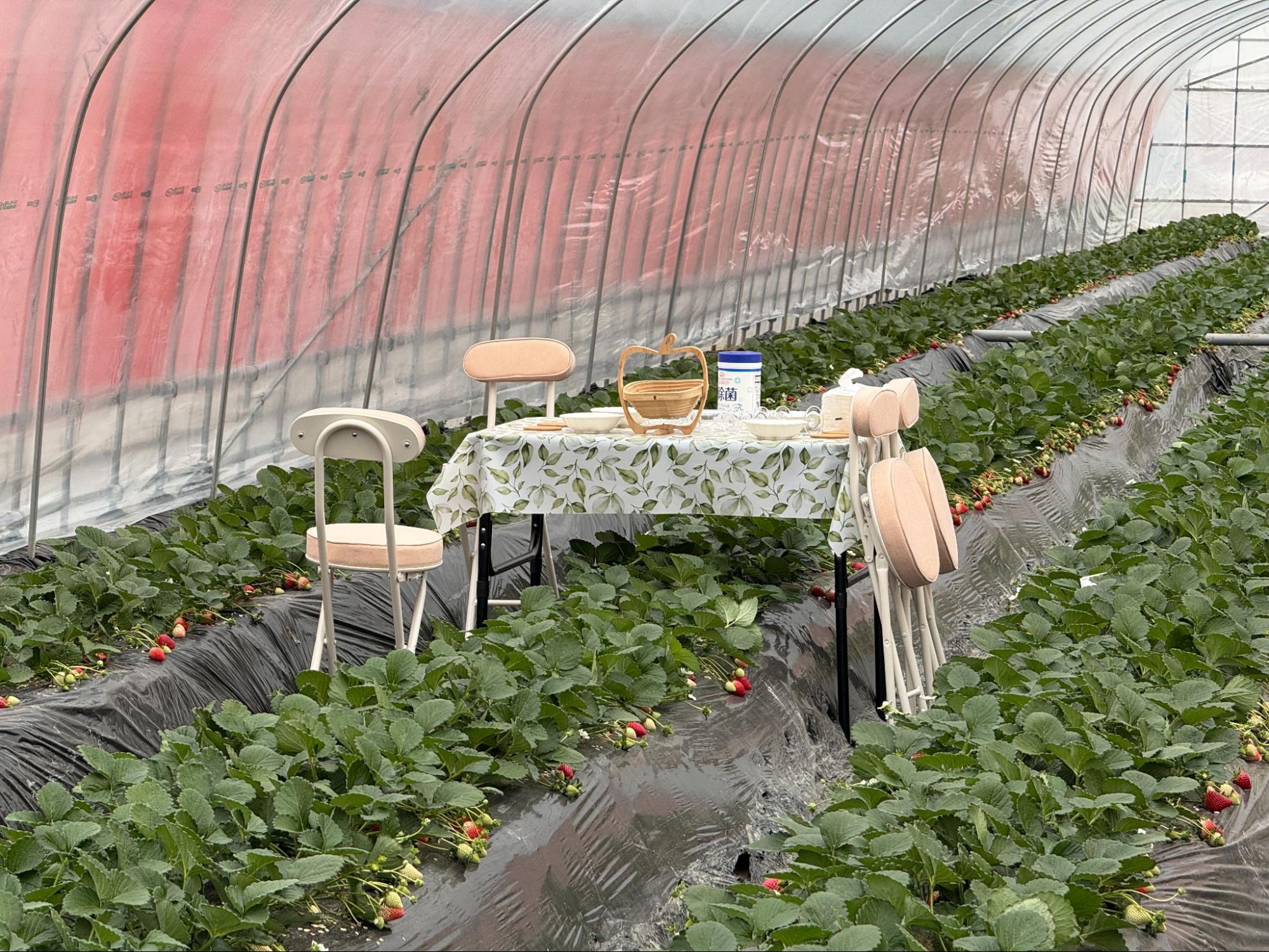 在果园内,除了整齐排列的草莓植株,还贴心设置桌椅,让人可以坐下来慢慢品尝亲手摘下的果实。现场也准备草莓汽水、可搭配的香槟,以及炼乳,让采草莓这件事不只是弯腰摘果,而是可以放慢步调、好好享受的时光。阳光透过温室洒落,空气中带着淡淡果香,让人不自觉沉浸其中。