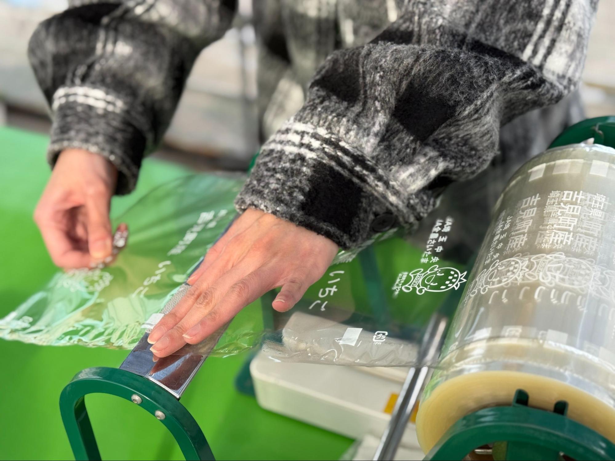 现场准备好的包装盒质感非常细致,工作人员先示范包装方式,如何将一片片透明包装膜仔细撕下,接着覆盖并贴合在草莓盒上,完成贩售时常见的包装样式,接着让大家亲自体验。