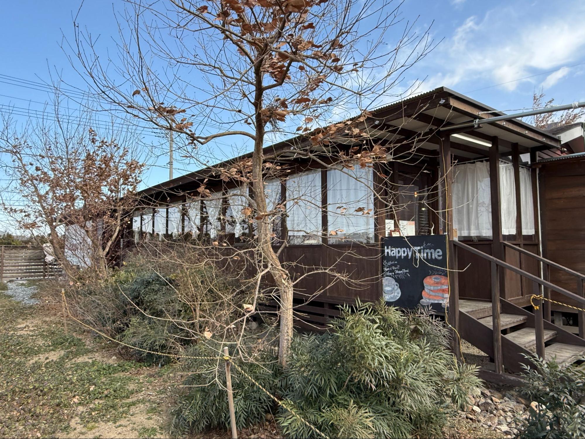 完成草莓包装体验后,再次搭上专用接送车前往午餐地点。餐厅「Happy Time(ハッピータイム)」是一幢长条型的木屋建筑,外观朴实温暖。