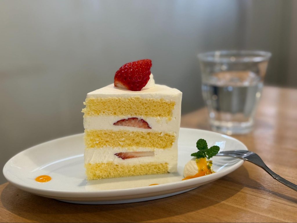 餐后登场的甜点,则让人会心一笑!使用与刚才采摘相同品种的「あまりん」制作的草莓海绵蛋糕。松软的蛋糕体搭配淡淡草莓香气,甜度恰好!