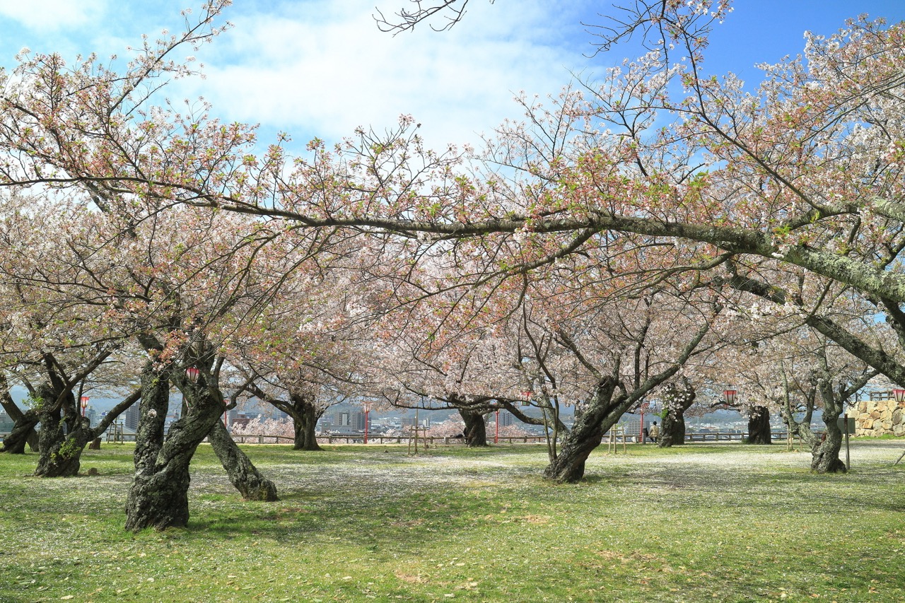 位于鸟取市的「鸟取城迹」,如今仅保留下天守与二之丸遗迹,周边则整备为市民日常休憩的 久松公园。每到春季樱花盛开时,园内约 240 棵染井吉野樱同时绽放,将历史遗迹妆点成柔和浪漫的春日风景。樱花满开期间,公园内会设置纸灯笼与在地路边摊,游客可在樱花树下漫步、赏花与小憩,感受一年一度的鸟取城迹春日风情。